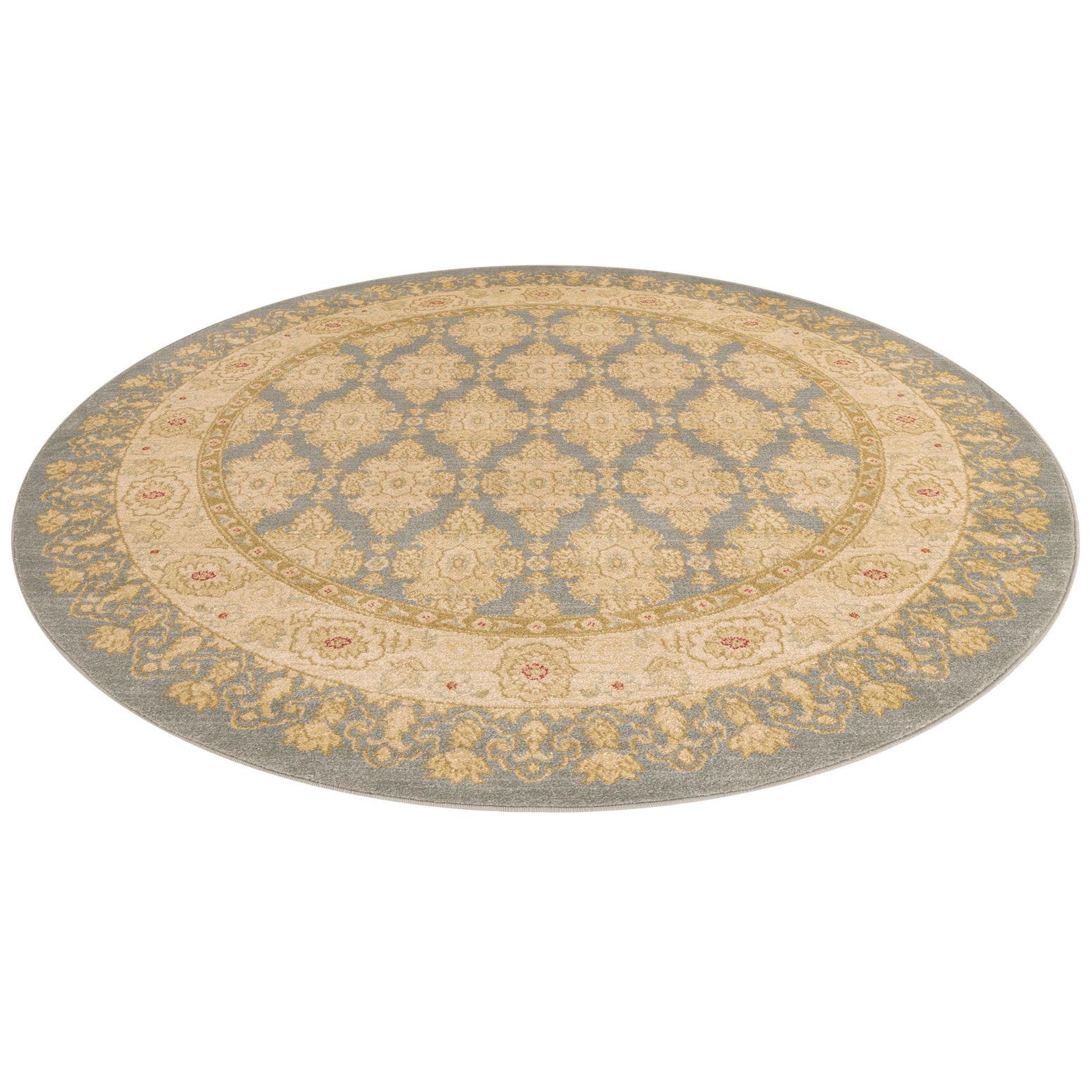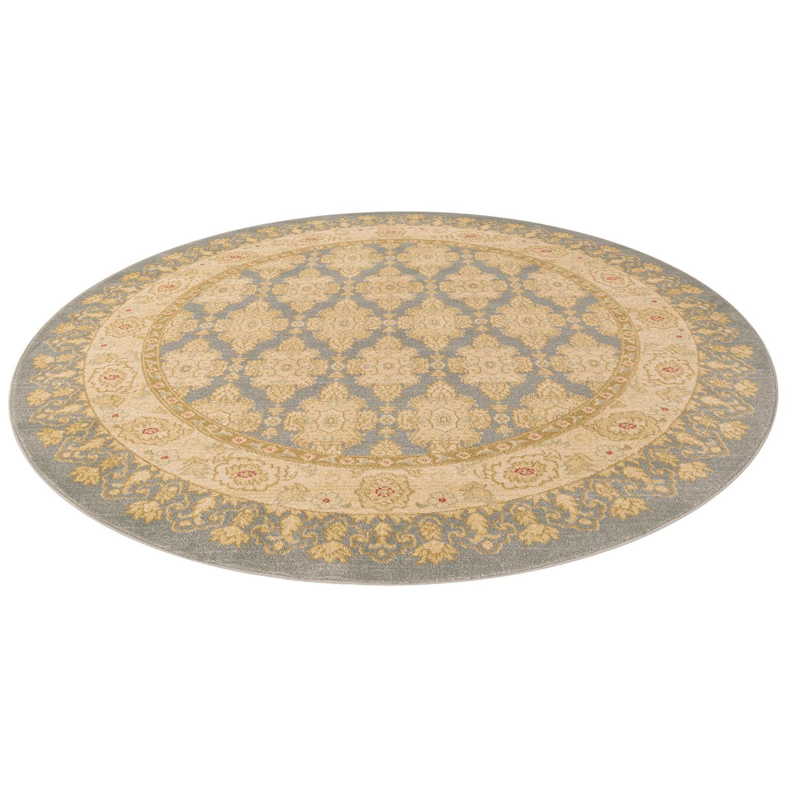 Machine-made in 100% polypropylene, the rug has a low-profile pile with a smooth, softly textured hand that keeps the pattern crisp and defined. It suits a variety of interiors: center it beneath a round dining table, anchor a living-room seating group, or place it in an entry with a small console and round mirror. Pair with warm wood tones, cream or beige upholstery, navy or light-blue accents and brass or antique-finish lighting for a layered, traditional-to-transitional look.