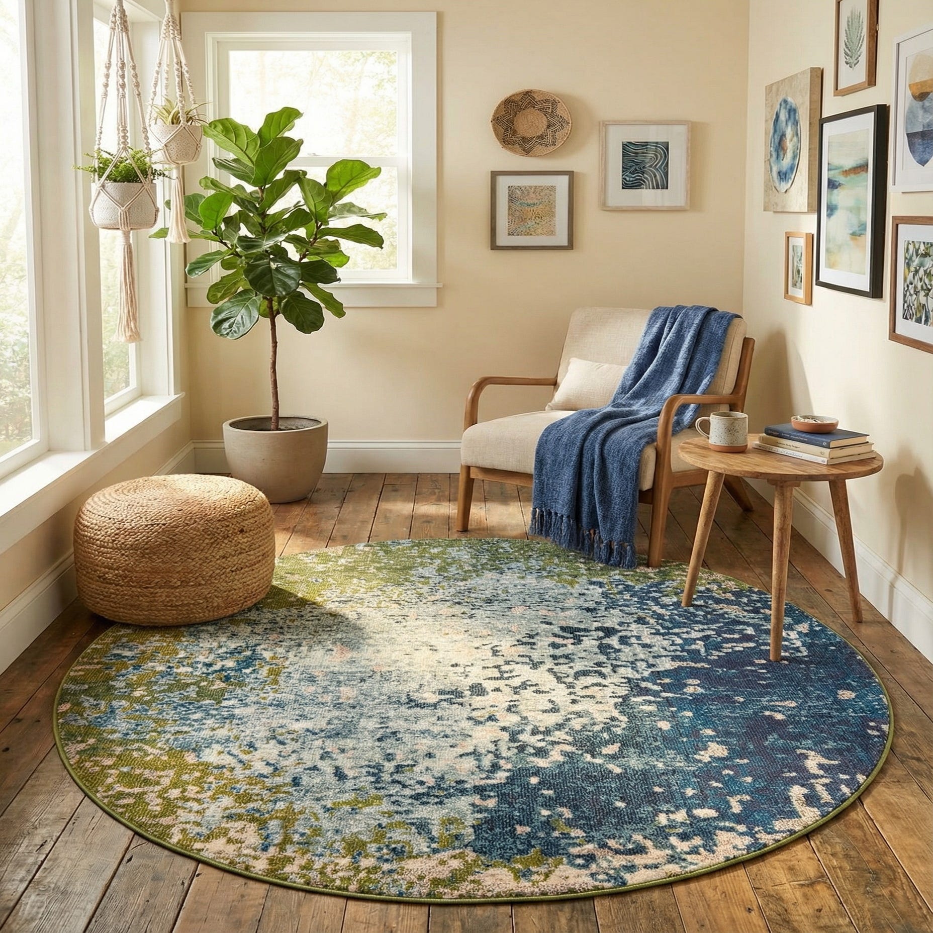 Machine-made from 100% polypropylene, the rug has a low, even pile that feels smooth underfoot and holds its shape well. Its balanced texture and color variety make it versatile: place it beneath a round dining table or in a cozy seating nook, layer it under a small coffee table to define a living area, or use it to add color to a bedroom. It pairs naturally with mid-century or contemporary furnishings, warm wood tones and brass finishes, navy upholstery, and indoor plants for a relaxed, modern look.