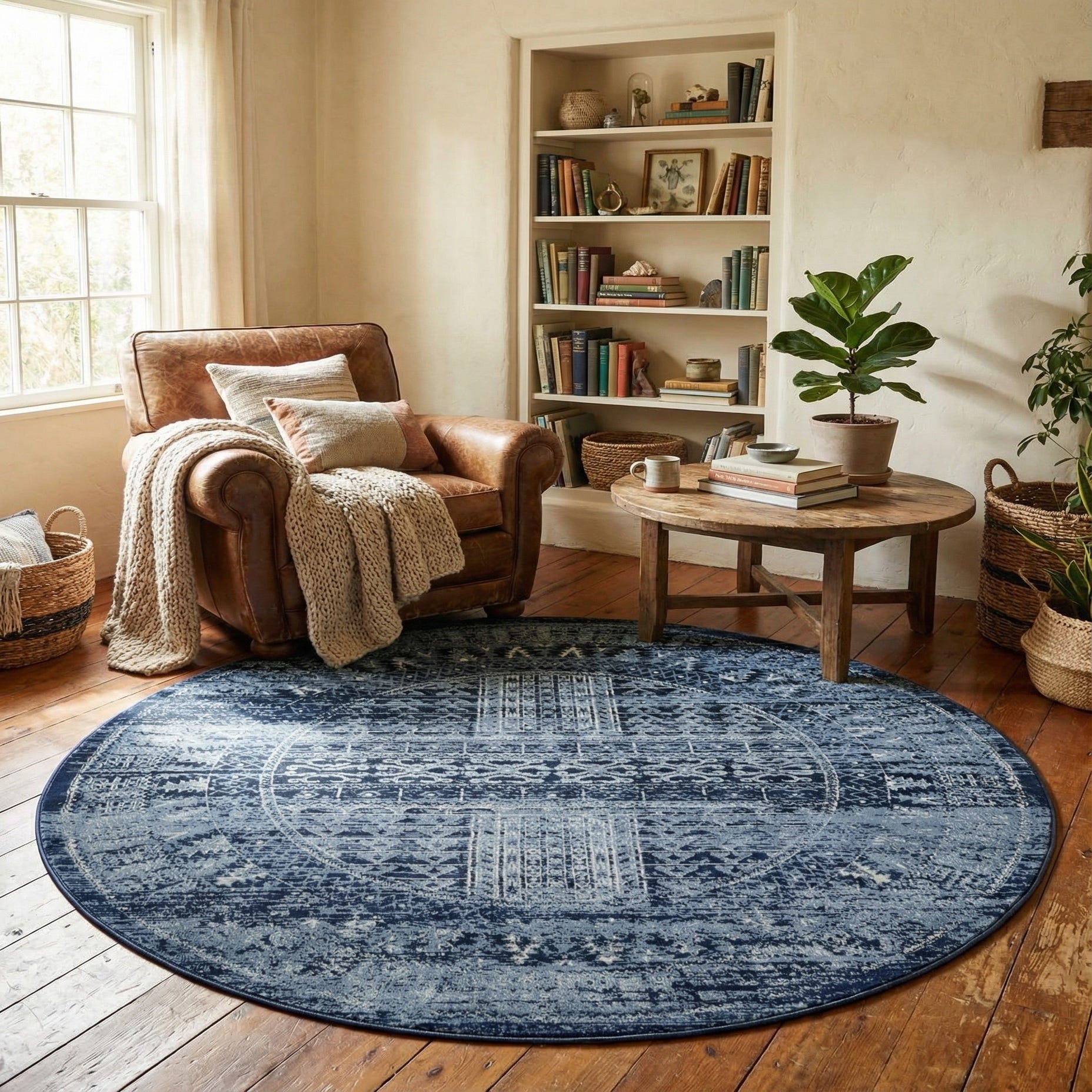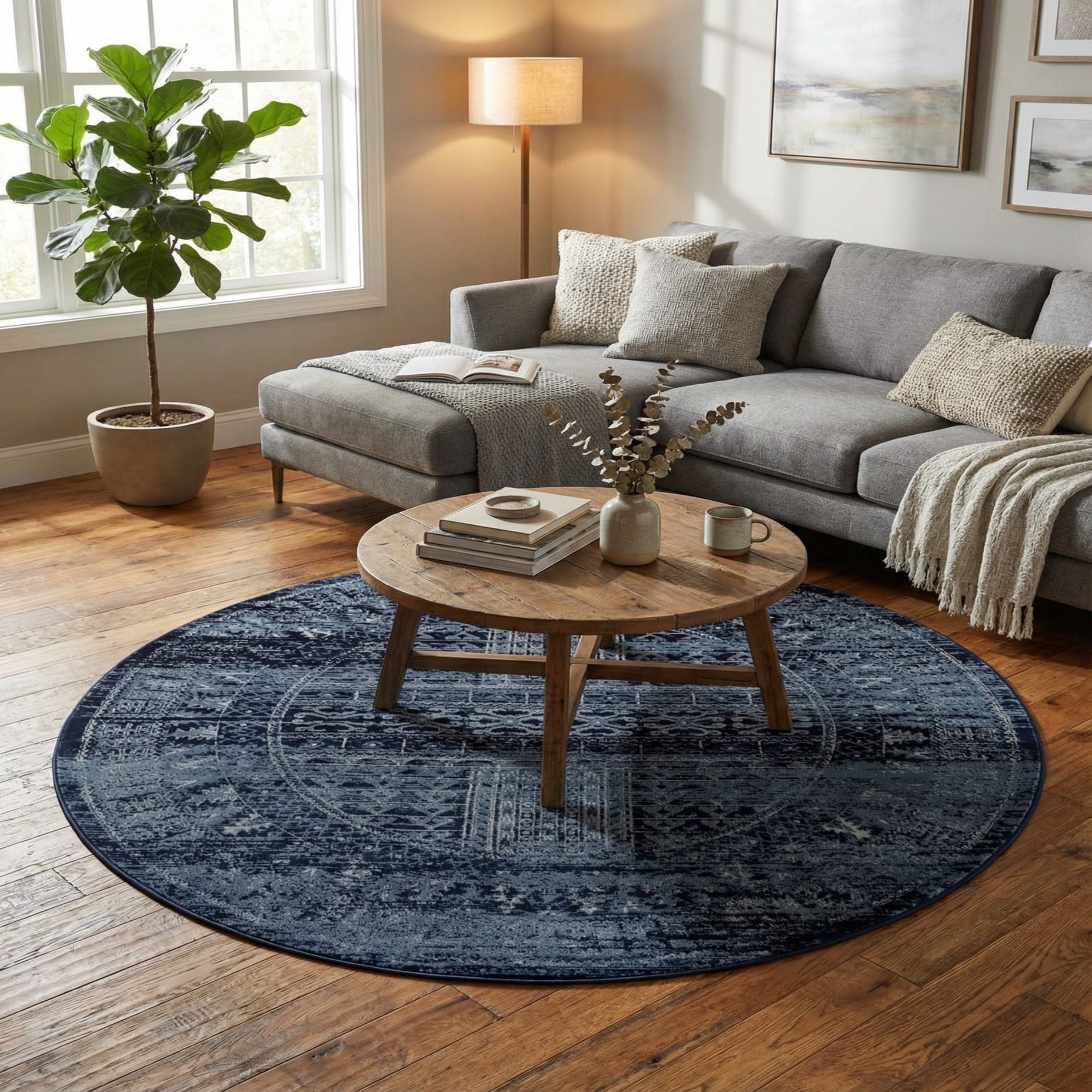 Machine-made from 100% polypropylene, the rug has a low, dense pile that feels smooth and slightly cushioned underfoot. The fibers deliver a soft, low-sheen finish that accentuates the subtle tonal variation in the design. It works well beneath a round dining table, as a focal point in a seating area, or placed under a bedside grouping; its blue and navy palette pairs naturally with light woods, brass or pewter accents, and neutral upholstery for modern-traditional, coastal, or transitional interiors.