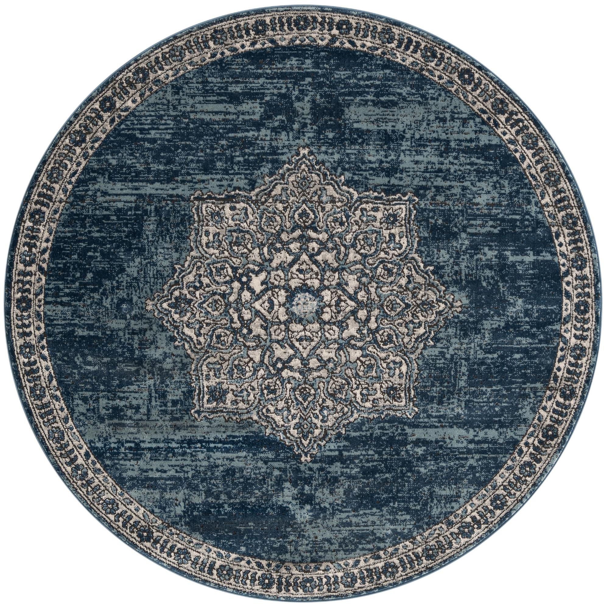A round, distressed blue rug with a light blue and cream medallion pattern in the center and a matching border.