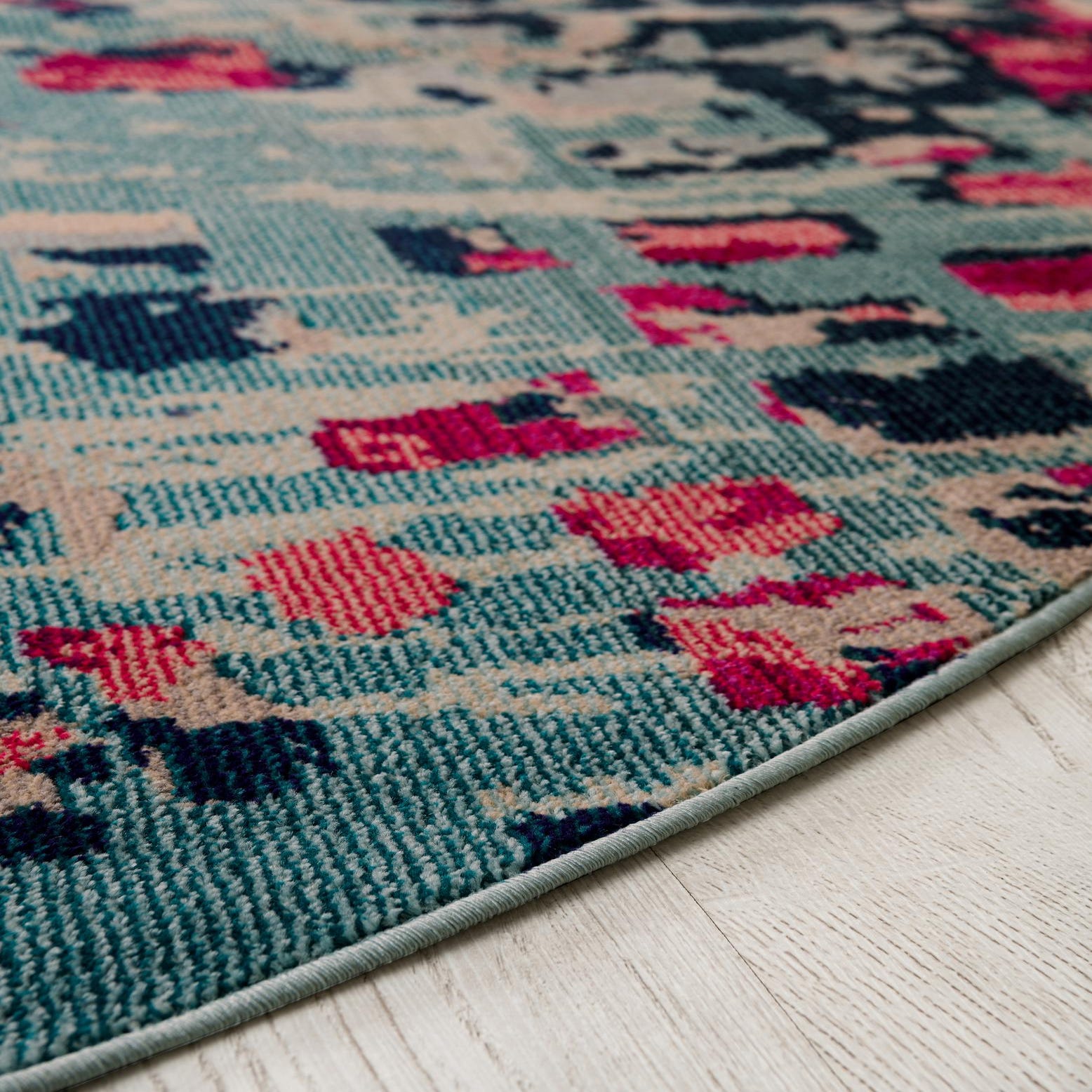 The polypropylene construction gives the rug a low-profile, soft hand that feels comfortable underfoot while allowing furniture to sit evenly. Use it to anchor a conversational seating area, beneath a small round dining table, or as a focal accent in a bedroom or home office. It pairs well with coastal, modern eclectic, or transitional interiors — layer it over natural wood floors or beside a neutral sofa to let the colors energize the room.