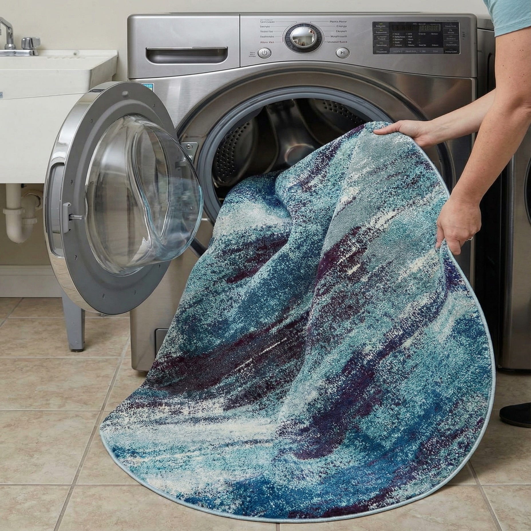 This round piece works well under a circular dining table or centered in a seating area to define the space and add color. It pairs naturally with light or mid-tone wood furniture, metal legs, and neutral upholstery—accent with navy or turquoise pillows to tie the palette together. The contemporary, slightly worn aesthetic suits coastal, modern, or transitional interiors and can also add visual interest to a bedroom, home office, or entry zone.
