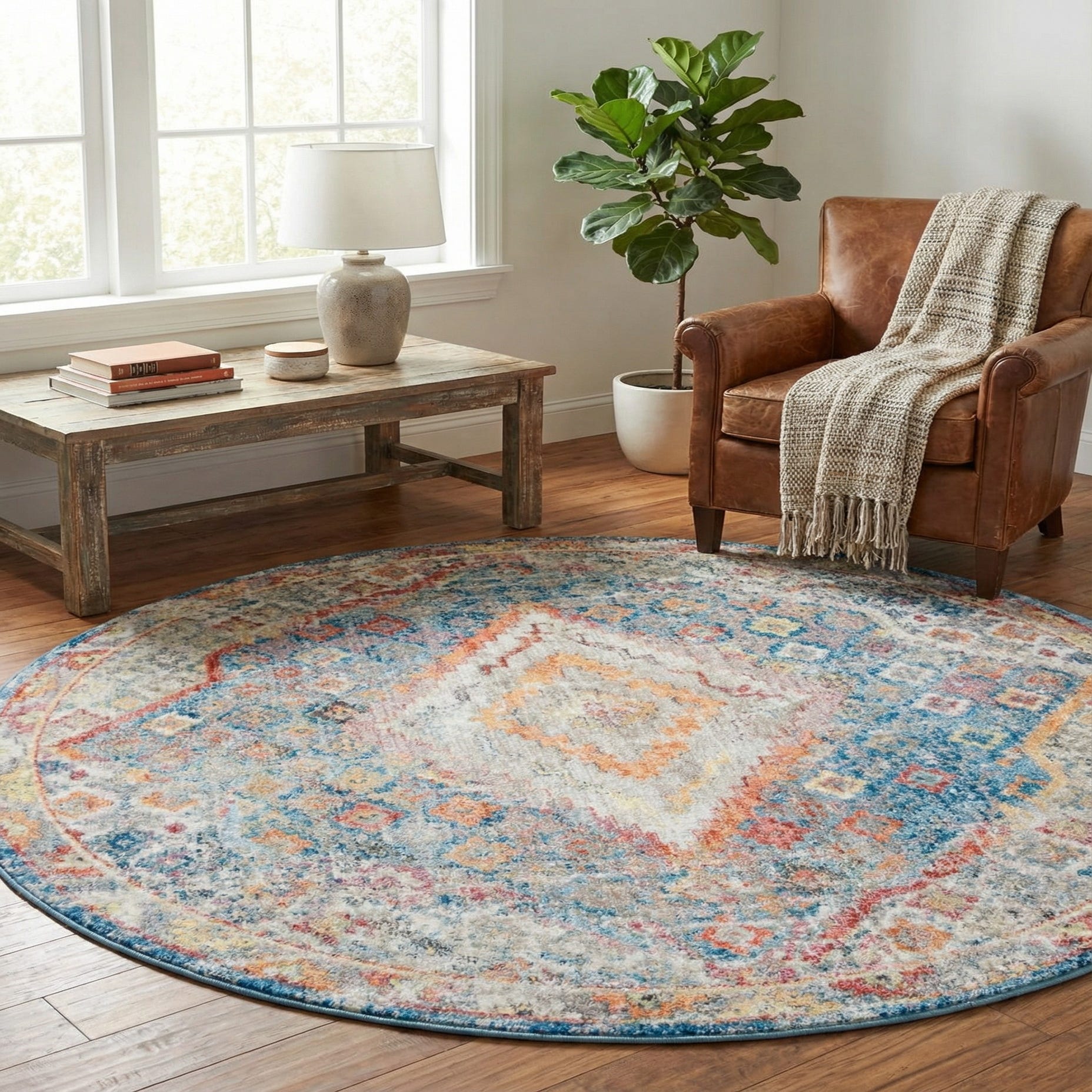 This piece works well where you want pattern and color without overwhelming the room: place it beneath a round dining table to soften the dining area, layer it in a living room seating arrangement to define the conversation space, or tuck it into a reading nook or bedroom sitting area for added warmth. It pairs naturally with light wood or rattan furniture for a casual, coastal or bohemian approach, and also complements navy or neutral upholstery and warm metal accents for a more transitional look.