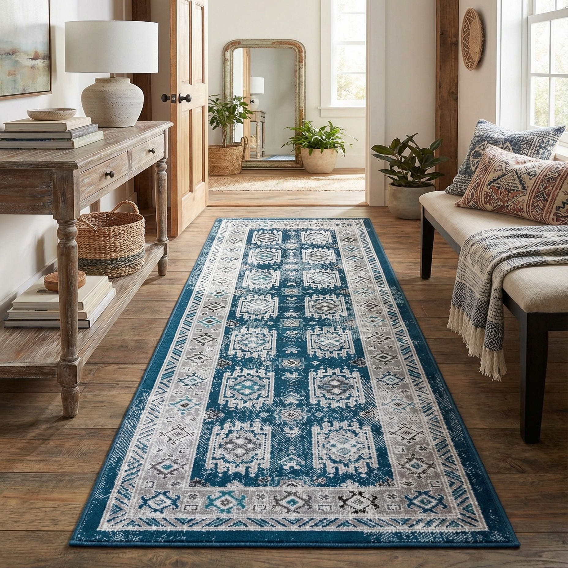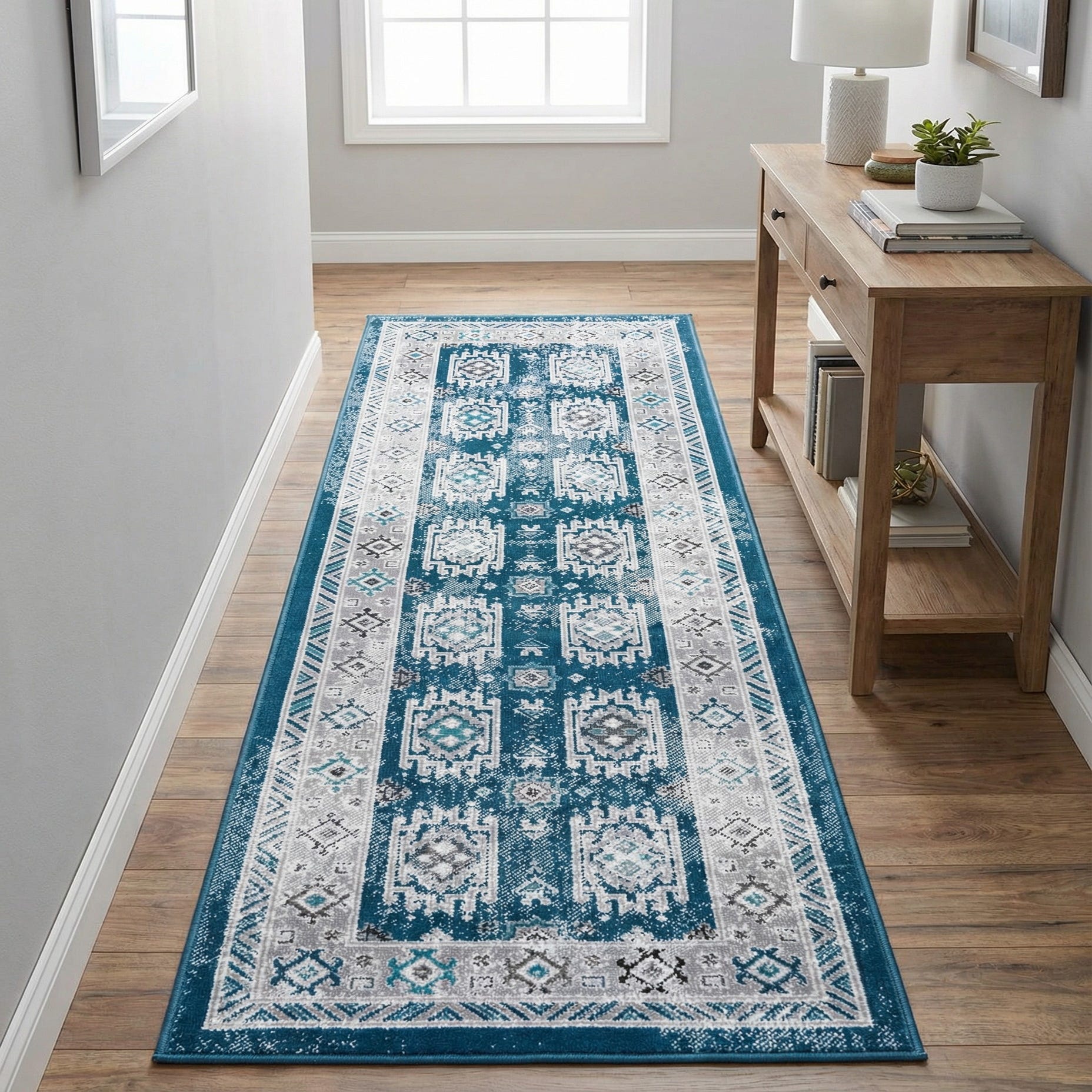 Machine-made from 100% polypropylene, the low-pile construction has a smooth, slightly cushioned hand underfoot and holds clear pattern definition in everyday use. Use this runner to anchor a hallway or entryway, line a narrow kitchen or corridor, or layer it at the foot of a bed to introduce color and rhythm. The blue, ivory, gray and black palette pairs well with coastal, transitional, or eclectic interiors and complements both light and dark wood tones.