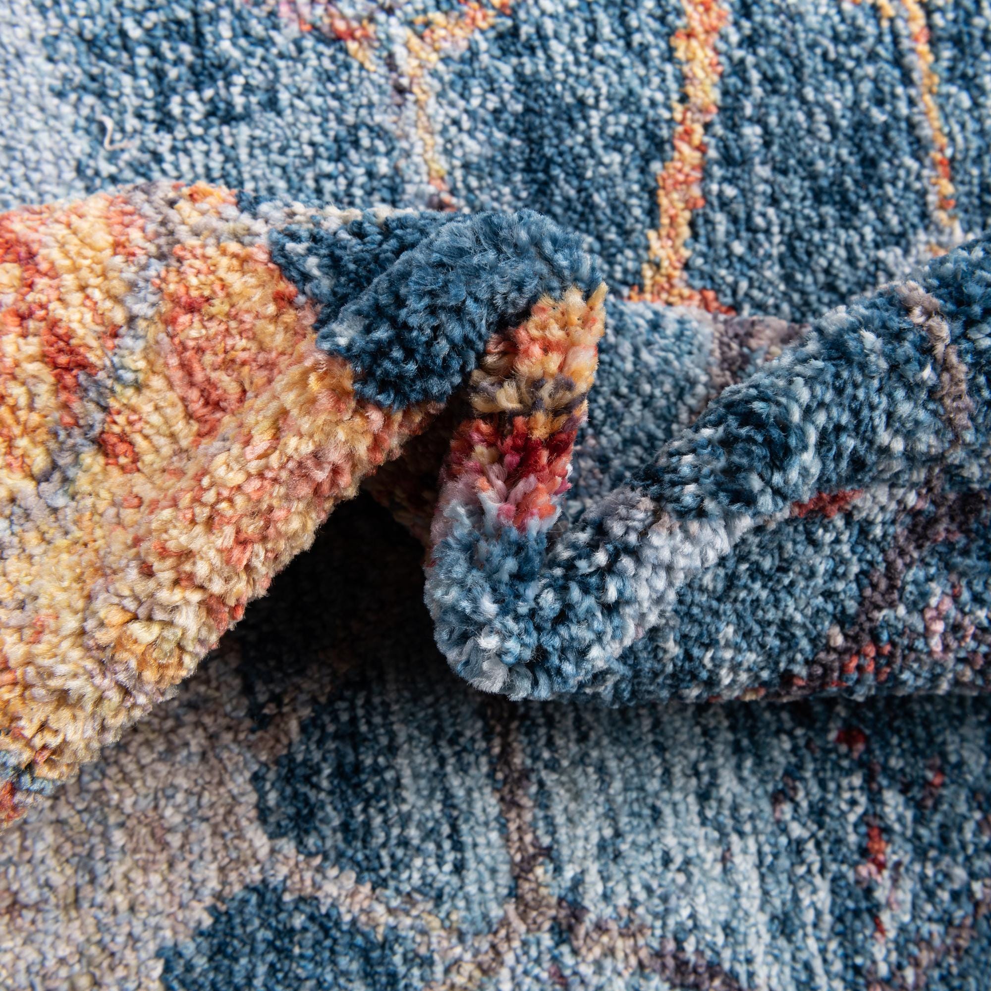 Primary color is Blue. Colors in this rug include: Blue, Gray, Ivory, Light Blue, Navy Blue, Peach, Yellow, Red.