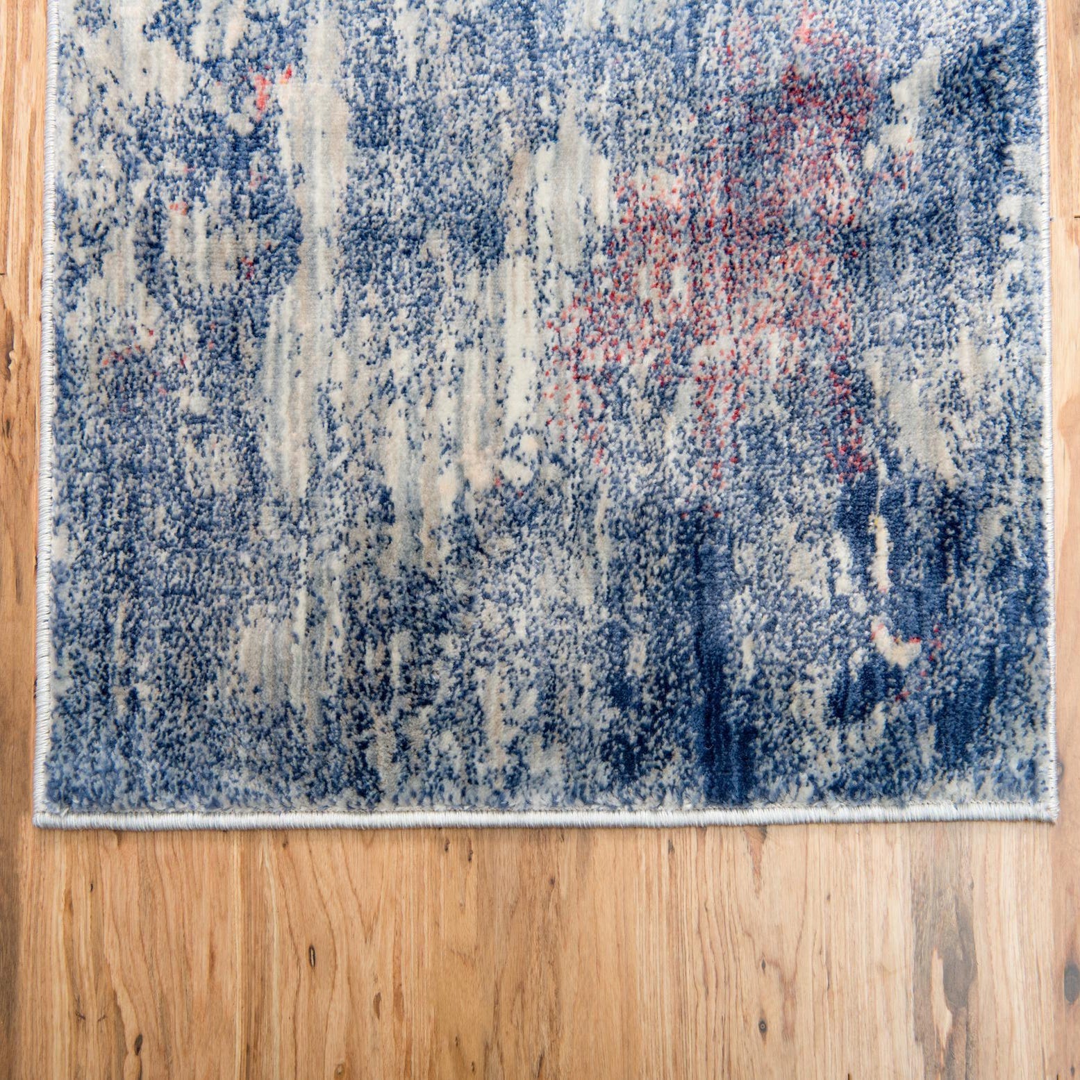 A soft, painterly runner with a blue ground, this rug blends abstract washes of light blue, ivory and beige with subtle pink accents for a layered, lived-in look. The pattern reads like watercolor and gentle abrasion, where denser blue areas contrast with airy ivory fields and scattered flecks of pink. Machine made from 100% polypropylene using space-dyed yarn, the surface has a fine, low-profile pile that feels soft underfoot and shows depth from the variegated fibers.