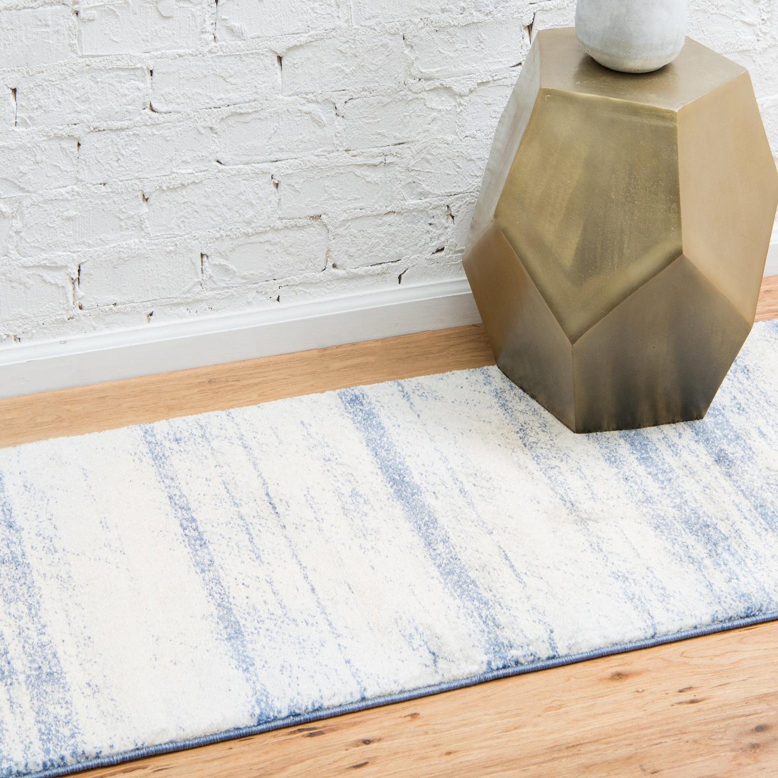 A 6 ft runner rug featuring a modern, abstract stripe pattern in varying shades of blue and cream, ideal for a hallway or kitchen.