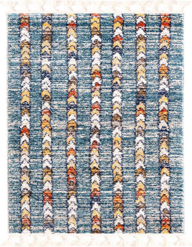 Primary color is Blue. Colors in this rug include: Blue, Ivory, Light Brown, Navy Blue, Rust Red.