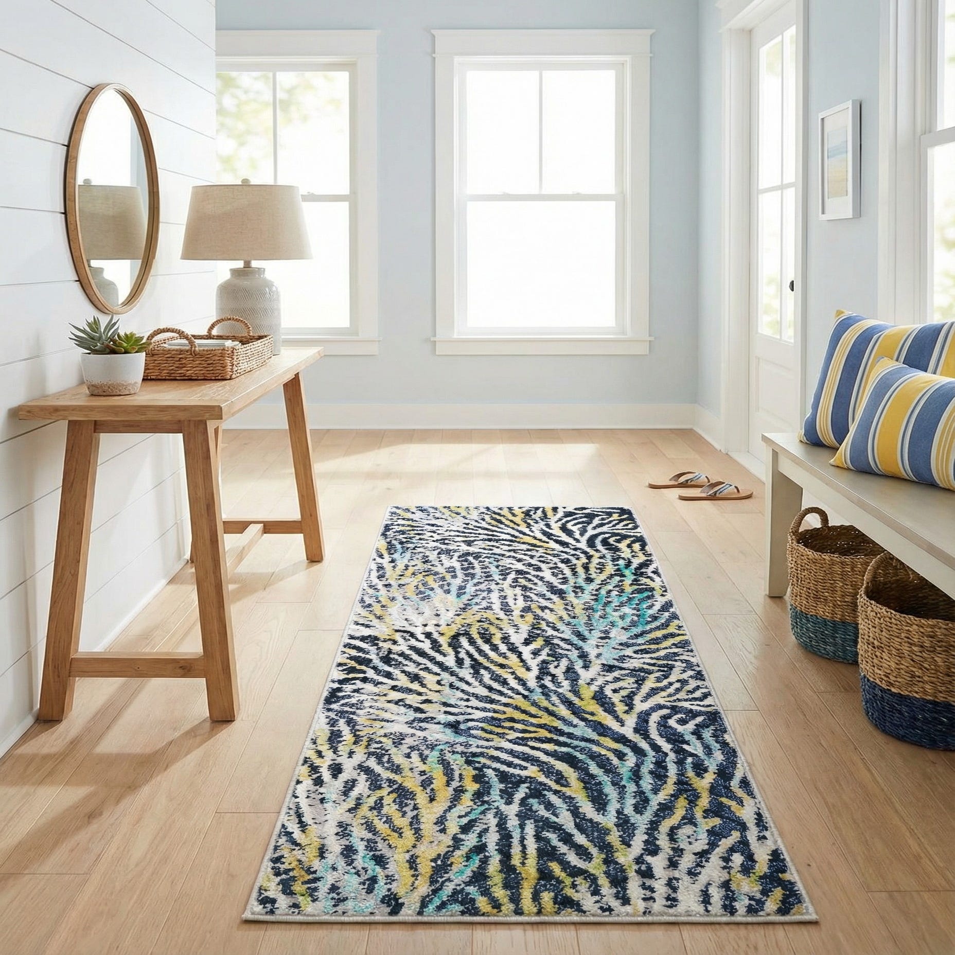 Use this runner to enliven a narrow entryway or hallway, anchor a galley kitchen, or add pattern to the space in front of a console or bench. It pairs well with light oak or gray floors, navy or white upholstery, and modern coastal or transitional decor schemes. For a bolder application, layer it against mixed-pattern cushions and metallic accents to complement the yellow and gray highlights.