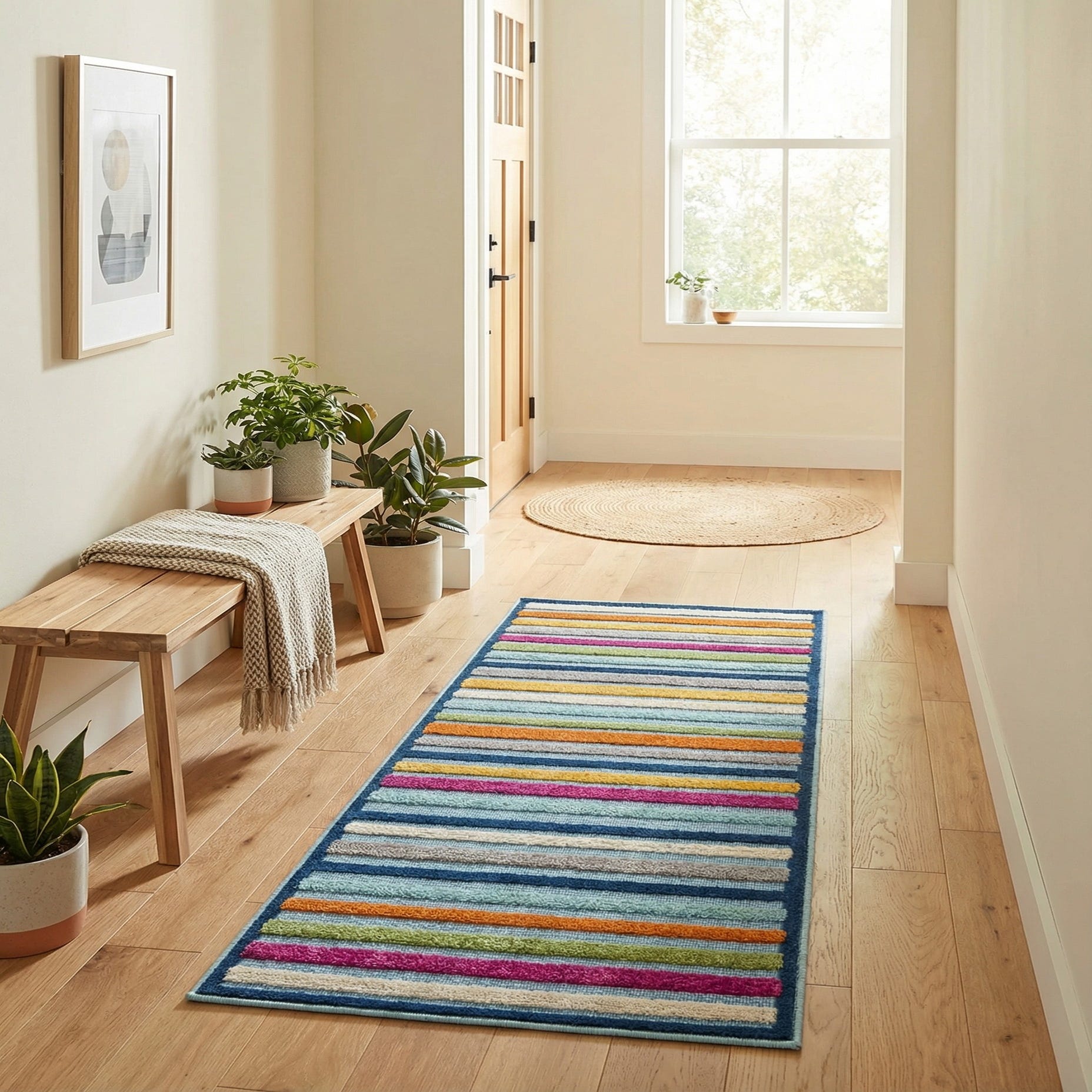 Machine-made from 100% space-dyed polyester, the rug has a tactile contrast between the soft, slightly cushioned pile of the colored stripes and the firmer, low-profile woven background. As a runner, it brings color and texture to entryways, hallways or a covered porch, and pairs nicely with light wood furniture, painted trim and coastal or contemporary decor. It also works well in a galley kitchen, sunroom or layered under a narrow console table to anchor a bright, casual interior.
