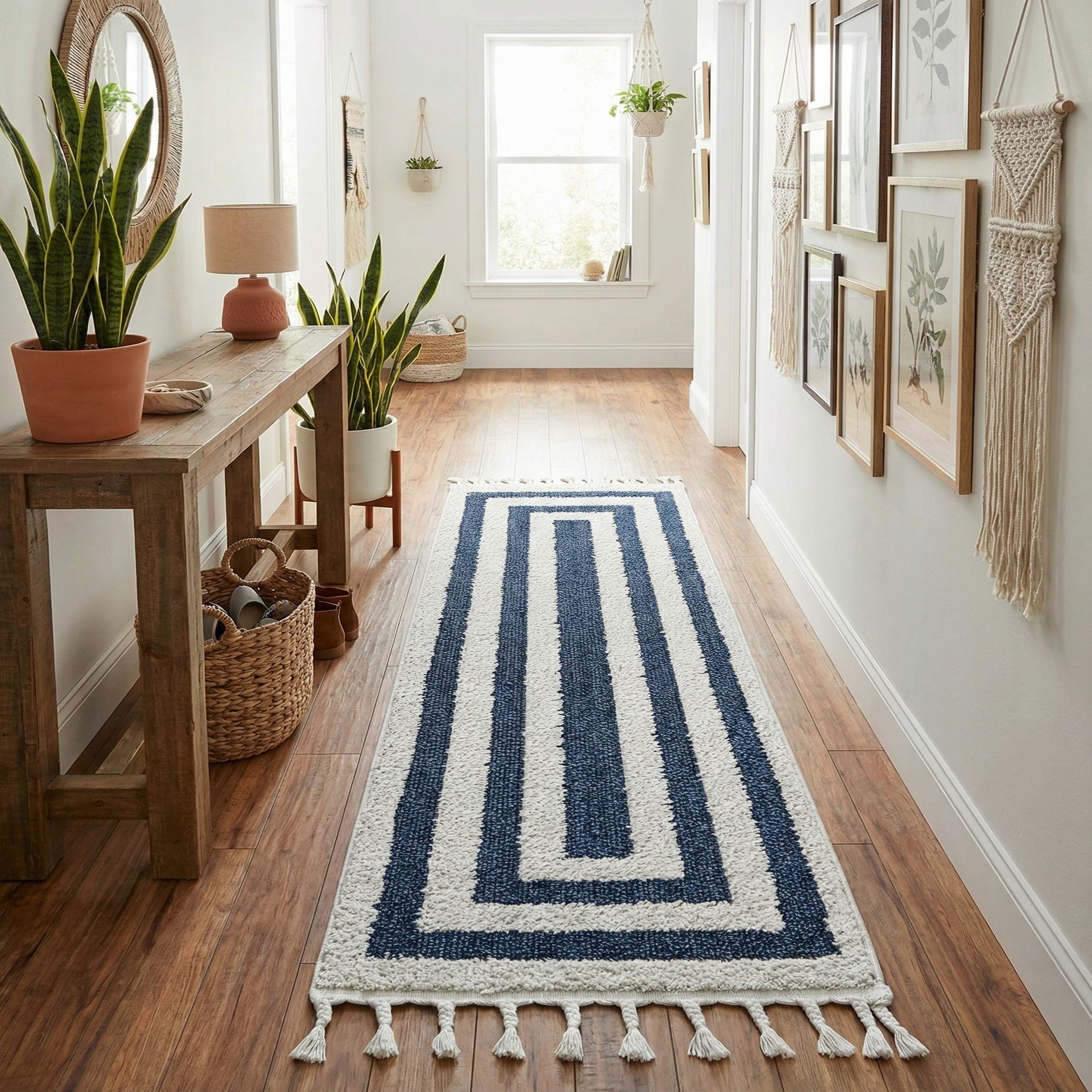 A 6 ft runner rug featuring a modern stripe pattern in varying shades of blue and white, with decorative tassels.