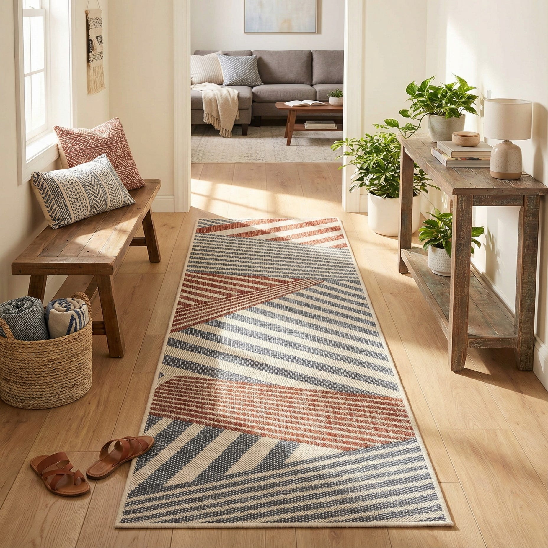 Machine-made from 100% polypropylene, the rug has a low-profile, tightly woven surface with a tactile, slightly textured feel where the stripe work is defined. Use it to add a focused, directional element to a hallway or entry, as a kitchen runner, or layered along a covered porch. It pairs well with light- or mid-tone hardwoods, white or navy cabinetry, woven natural accents, and streamlined furniture for contemporary, coastal-influenced, or modern farmhouse interiors.