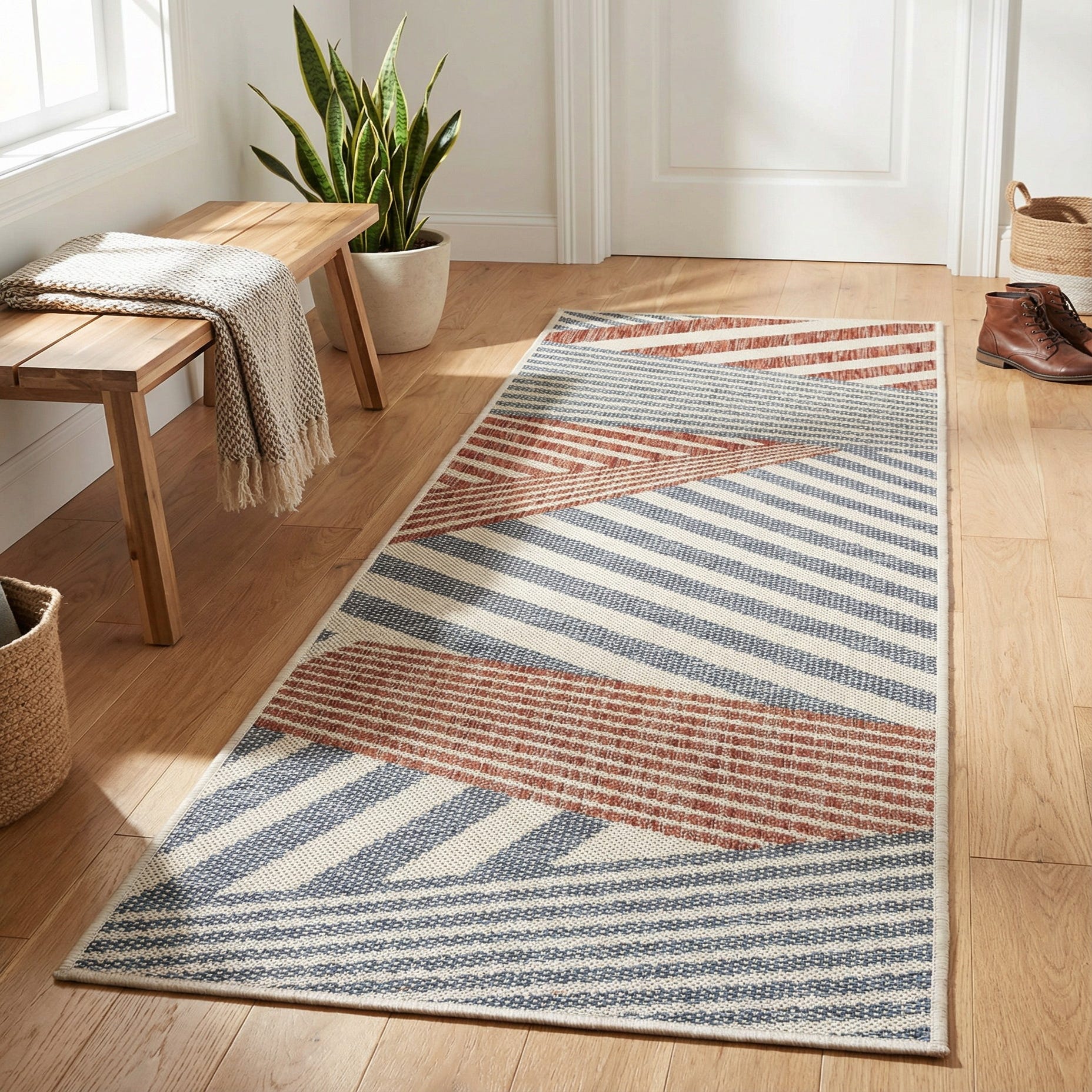 A graphic, linear runner with a blue background that anchors alternating diagonal bands of ivory and red. Narrow and wide stripes intersect at shifting angles to form geometric blocks that move down the length of the rug, with the red bands providing a warm contrast to the cooler blue and ivory field. The pattern reads modern and structured while the color pairing keeps the overall look balanced and approachable.