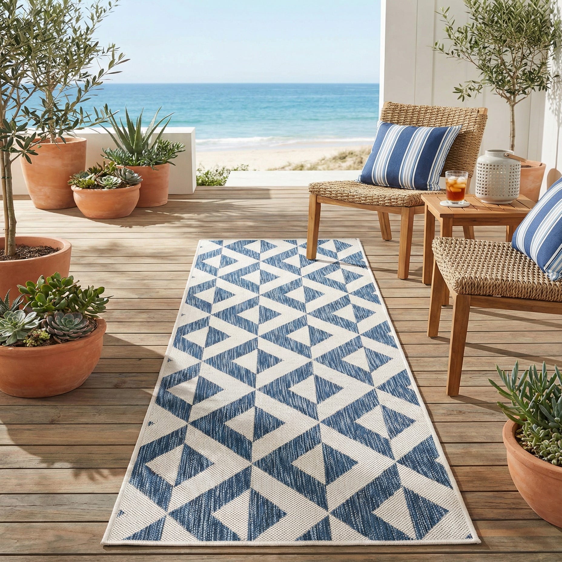 A crisp geometric layout of interlocking diamonds and chevrons sits in ivory against a blue ground, creating a modern, graphic look. The blue fields display subtle vertical striations that add depth and movement to the pattern, while the ivory shapes deliver clear contrast. Machine made from 100% polypropylene, the rug has a low-profile, flatweave texture that feels firm beneath your fingers with a slightly ribbed hand and a clean, woven surface.