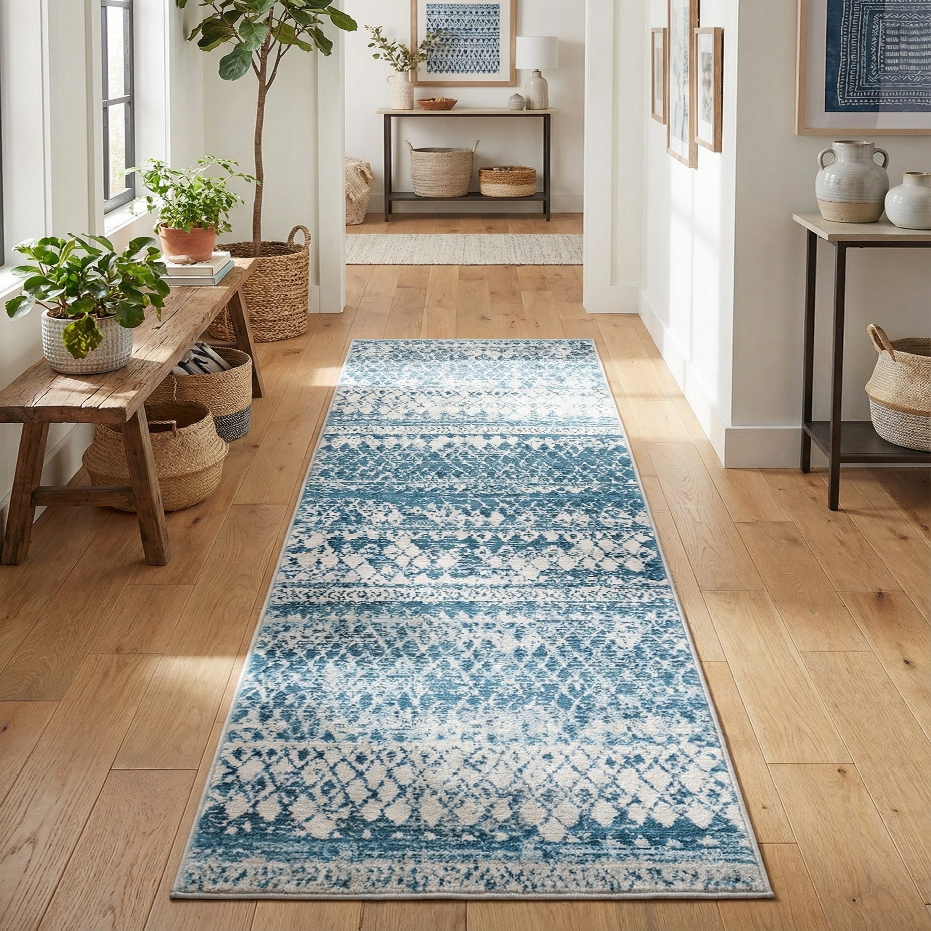 Machine-made from a 75% polypropylene and 25% polyester blend, the pile is soft to the touch with a low to medium profile that invites barefoot traffic while staying easy to place in active areas. The polyester highlights add a gentle sheen that lifts the blue tones, while the polypropylene body keeps the surface resilient. Use this runner to anchor a hallway or entry, add pattern and color to a narrow kitchen or mudroom, or layer it along the side of a bed in a coastal, contemporary, or farmhouse-inspired interior.