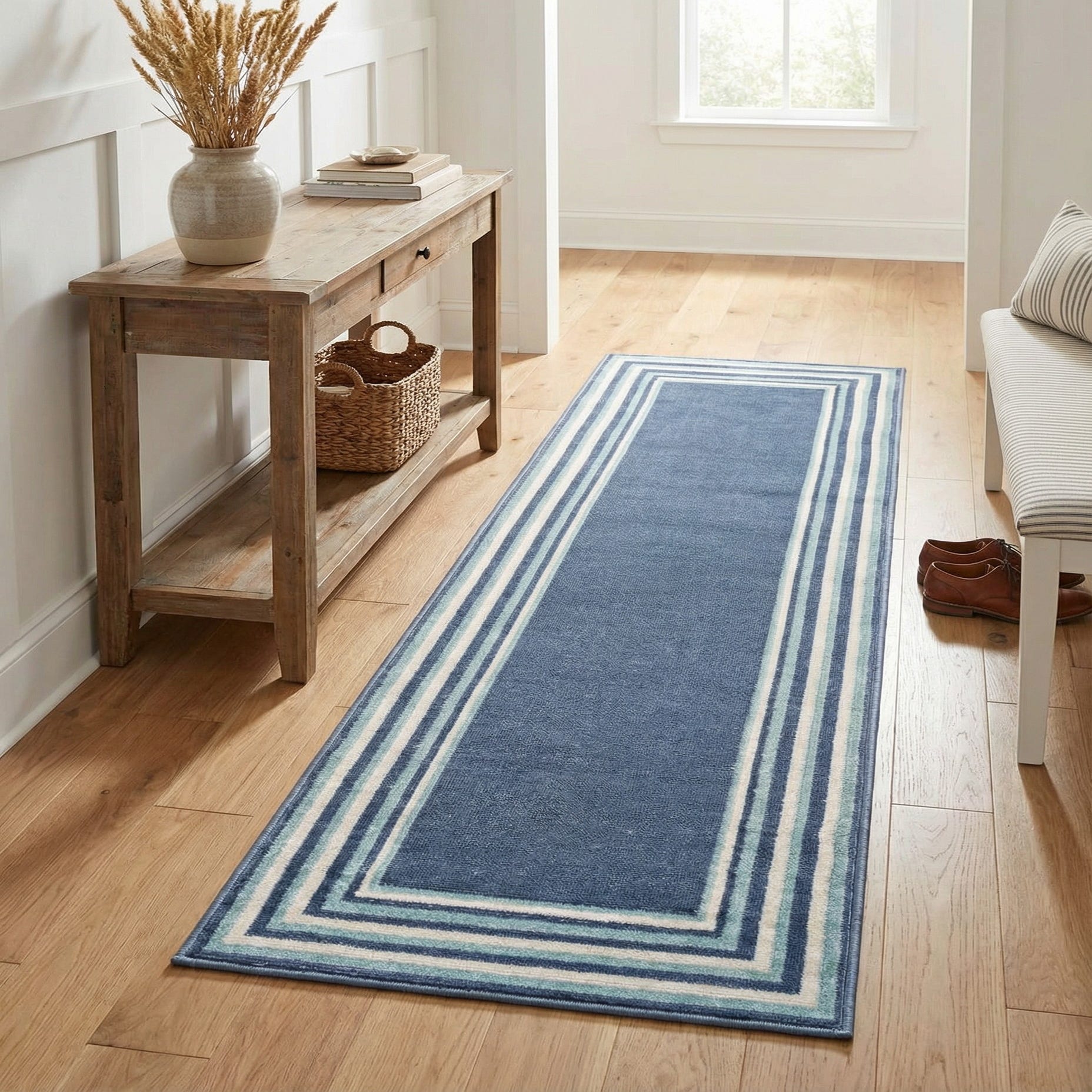 Ideal for a variety of interior design styles, this runner could serve as a refined touch in a minimalist setting, align with the cool tones of a coastal decor, or complement the crisp lines found in a modern and contemporary space. Whether placed in a hallway, alongside a kitchen island, or in an entryway, this piece integrates effortlessly, promoting a cohesive and stylish ambience.