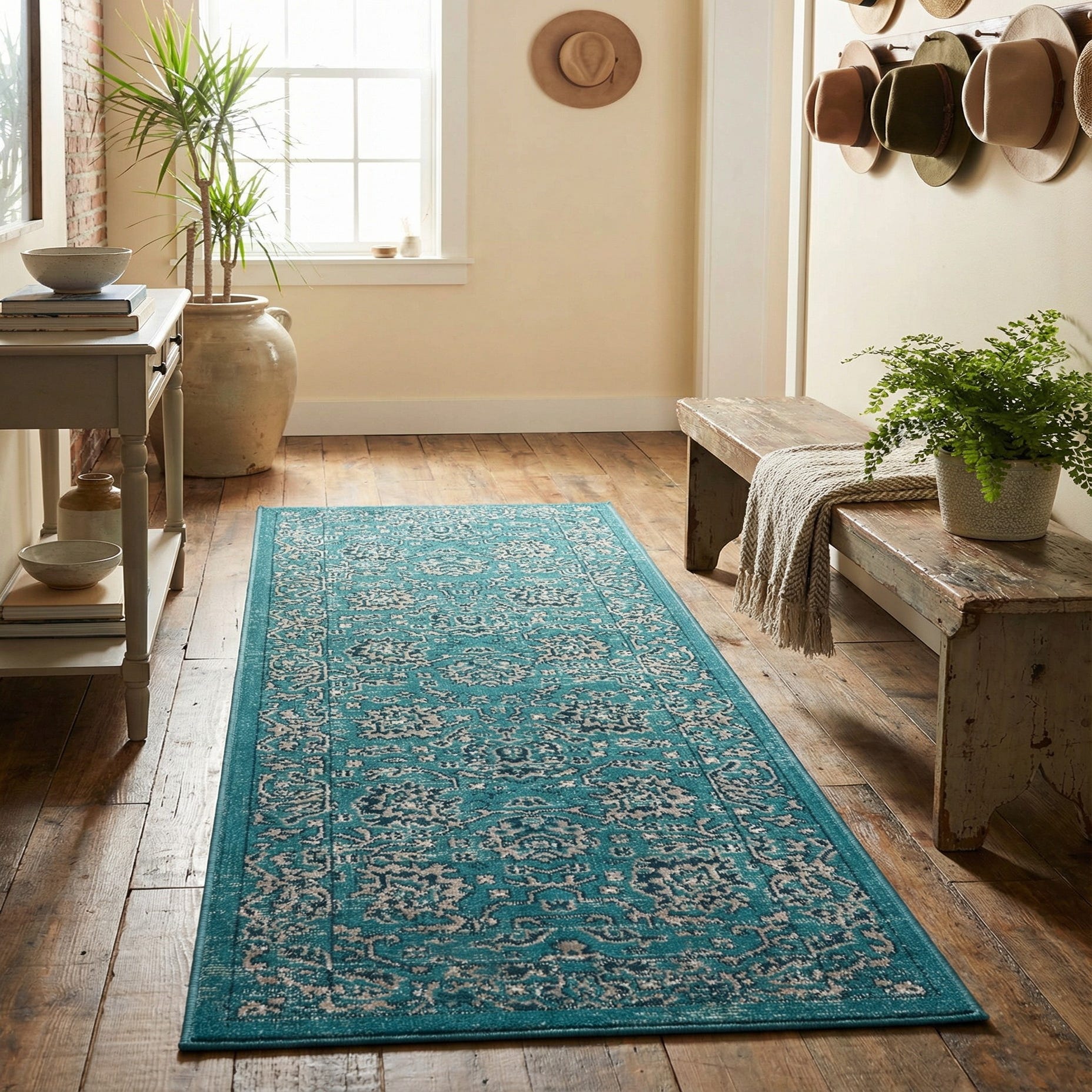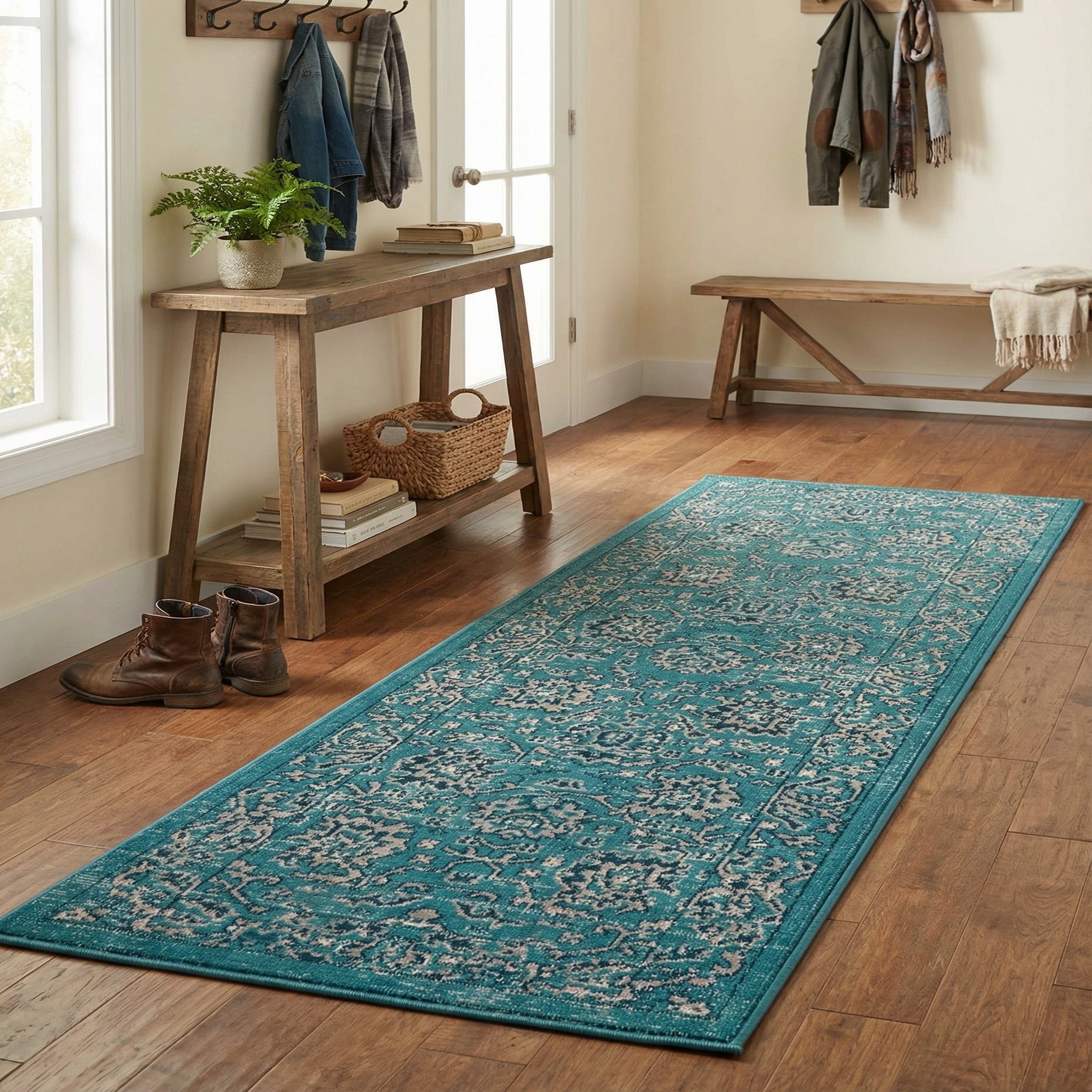 Ideal for hallways, entryways, or a narrow kitchen galley, this runner guides a space without overwhelming it. The blue field pairs easily with white trim and light wood floors for a coastal or transitional look, while the navy and gray accents coordinate with darker upholstery or brass and matte-black hardware in more traditional or contemporary settings. Use it to introduce color and pattern along traffic paths or layer it in front of a sofa to tie seating elements together.