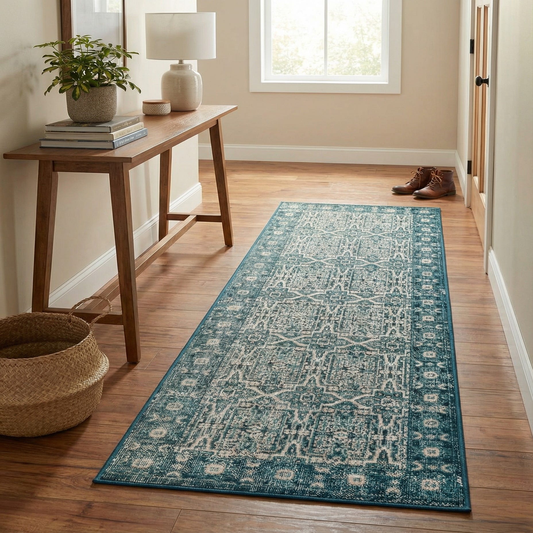 This runner works well in entryways, hallways, and narrow kitchen aisles where you want color and pattern without overwhelming the space. Pair it with light-wood or weathered furnishings for a coastal or farmhouse look, or use it to add contrast alongside mid-century and contemporary pieces in neutral grays and whites. The balanced palette and classic motif make it easy to layer with rugs or anchor a console table, bench, or narrow seating area.