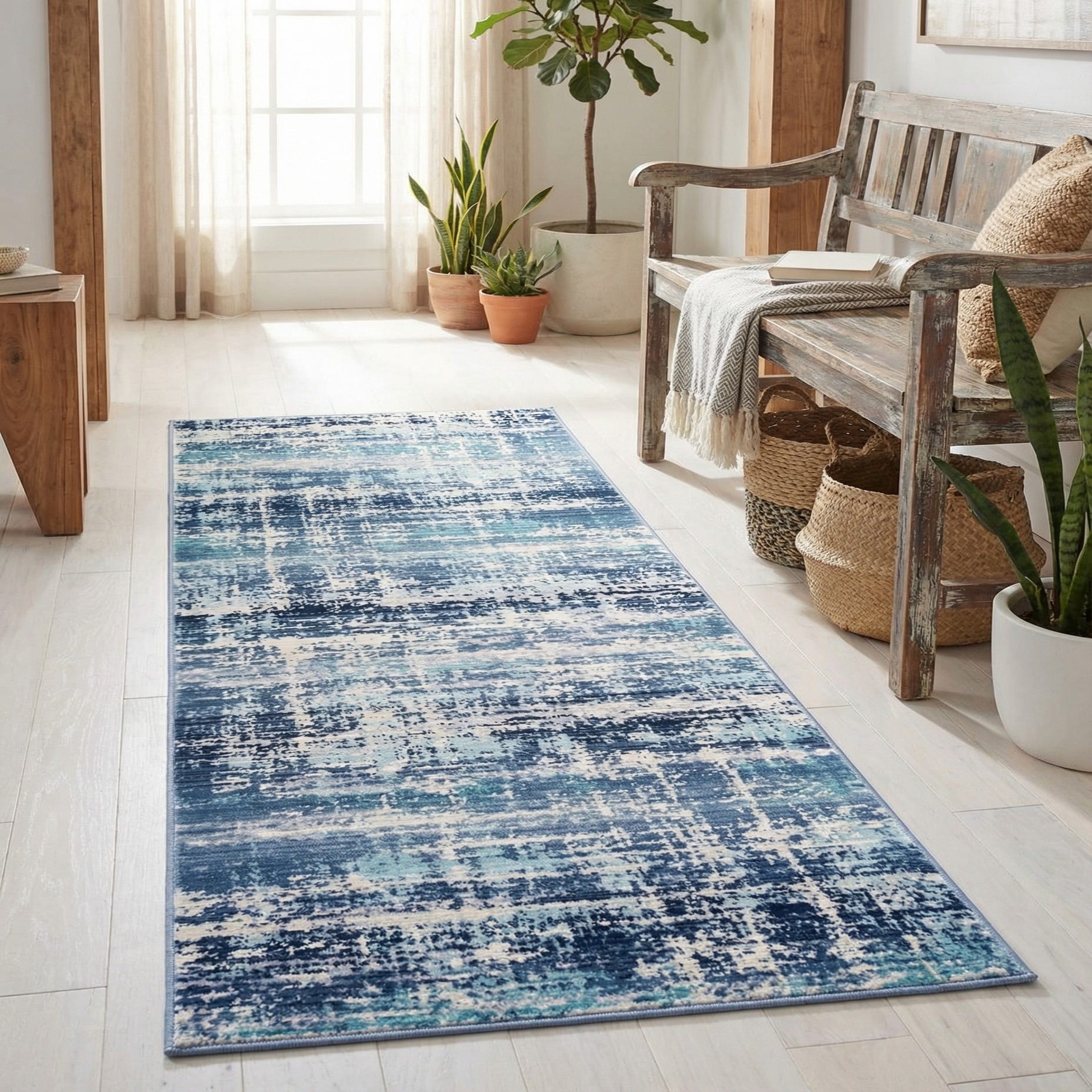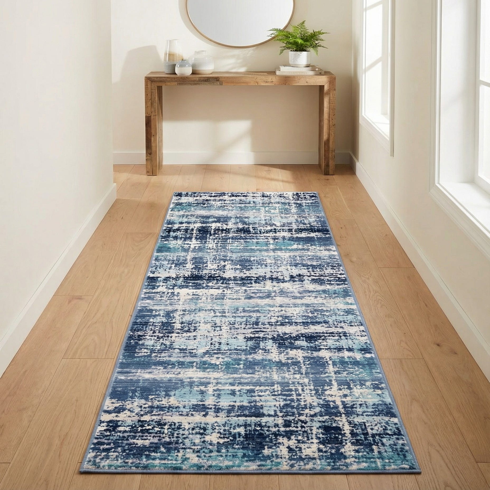 Designed as a runner, this piece anchors narrow spaces and circulation paths with color and pattern rather than heavy formality. It pairs well with light-washed woods, white or gray painted trim, and navy or teal accent pillows for a coastal or modern transitional scheme; it also complements brushed-metal fixtures and linen upholstery for bedrooms, hallways, kitchen galley spaces, or apartment entryways. The palette works equally with minimalist furniture or layered, textural interiors seeking a calming pop of blue.