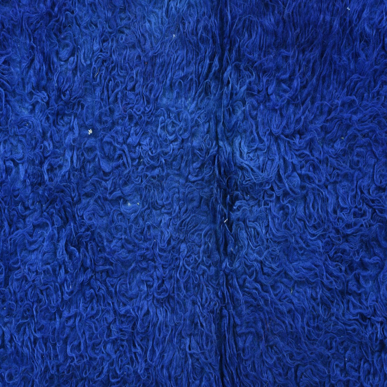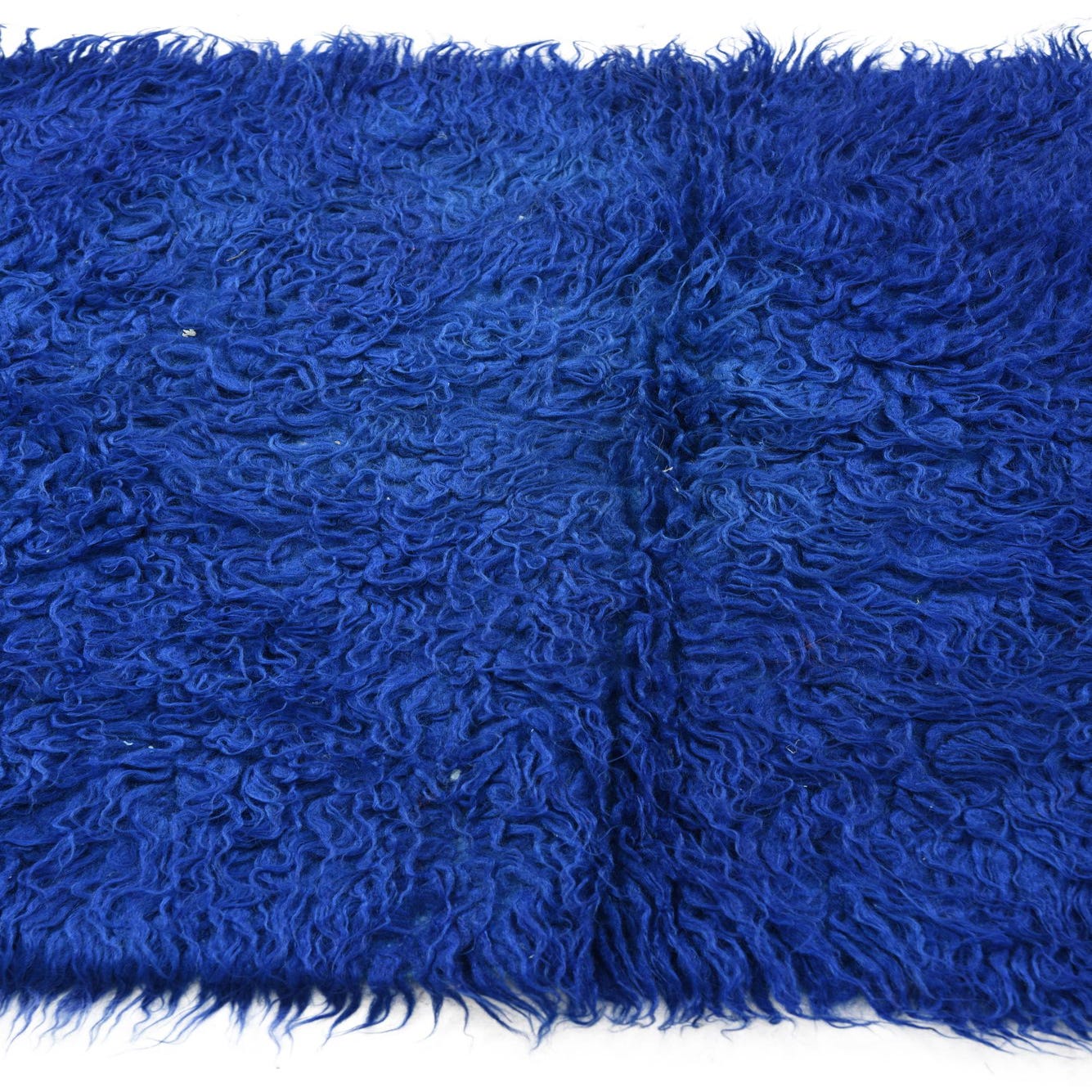 A plush, handmade 6 ft runner rug in a vibrant royal blue shag texture, perfect for hallways.