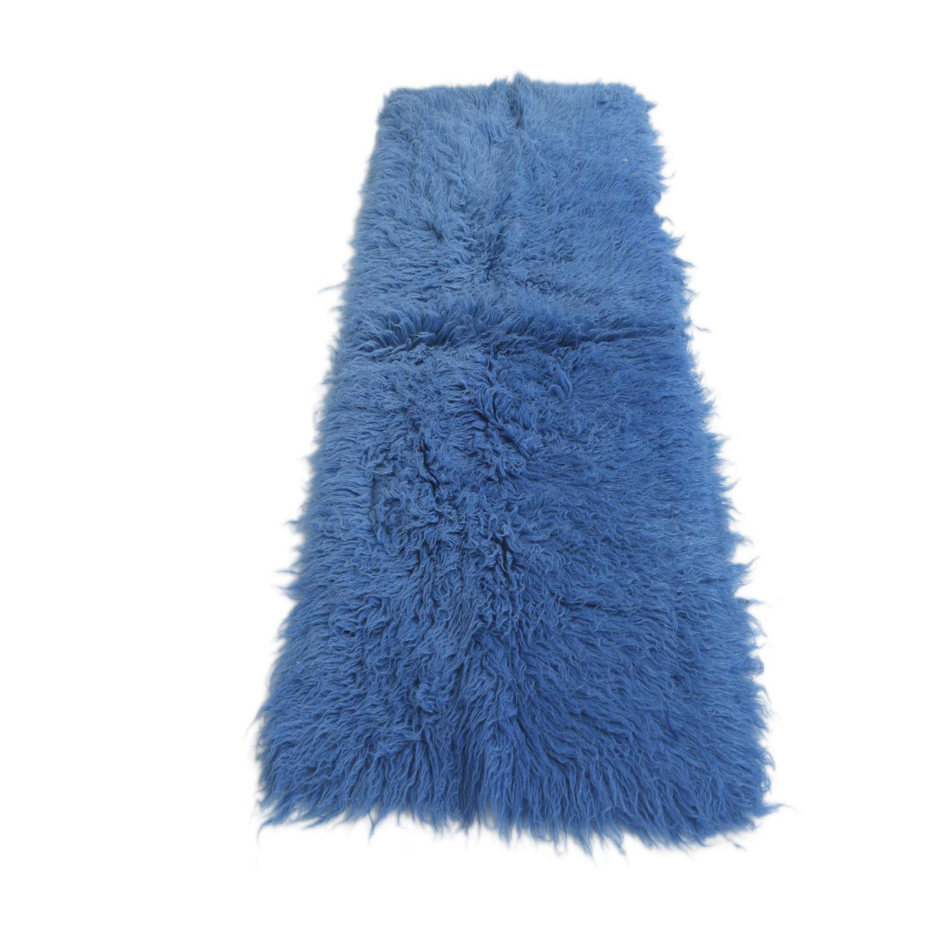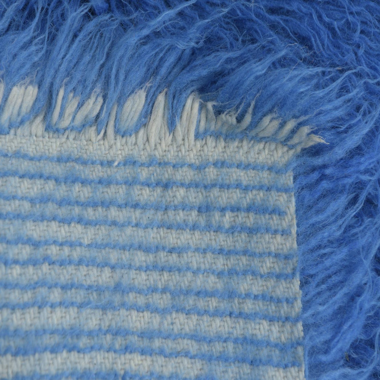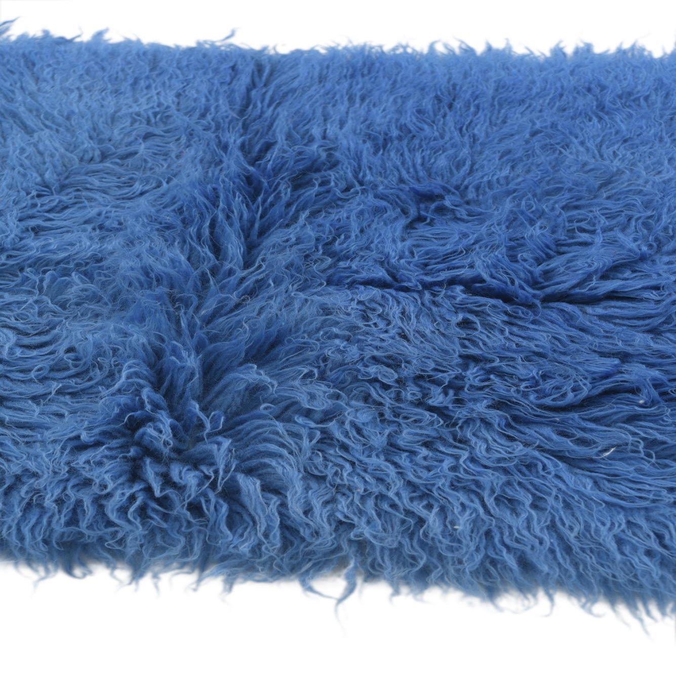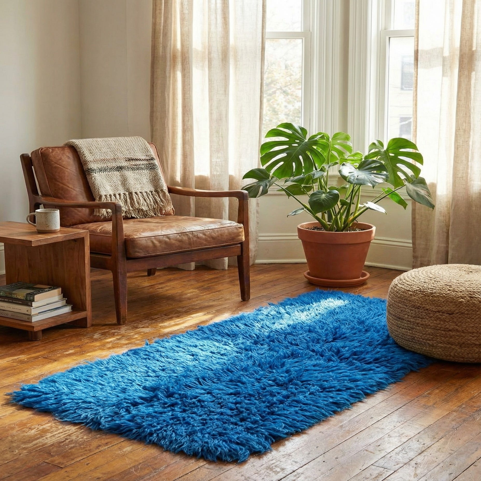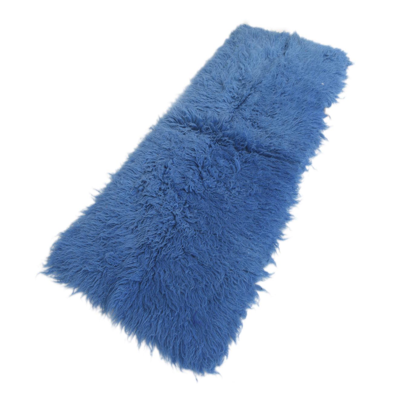 A vibrant blue 6 ft runner rug with a plush shag pile, handmade from wool, perfect for a hallway.