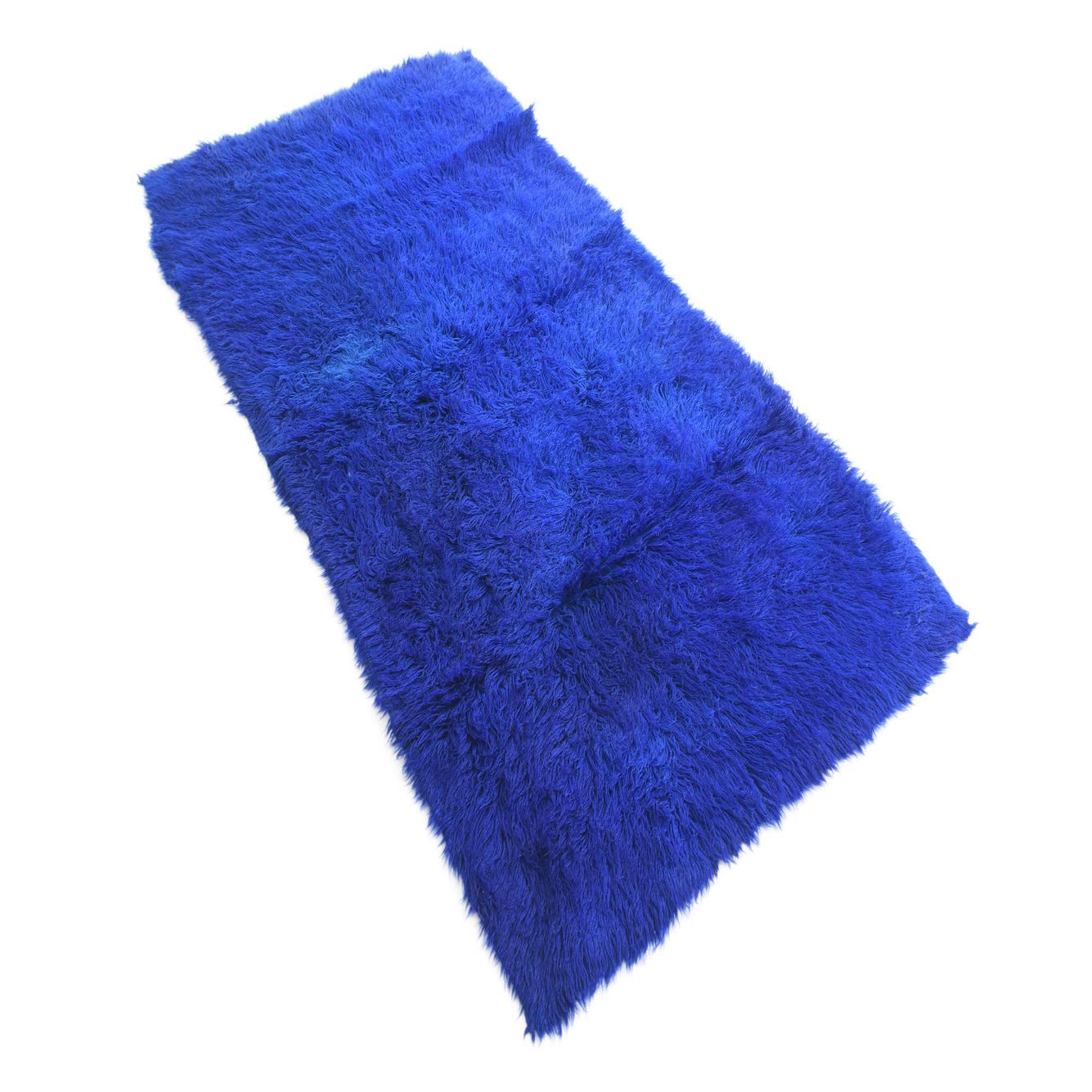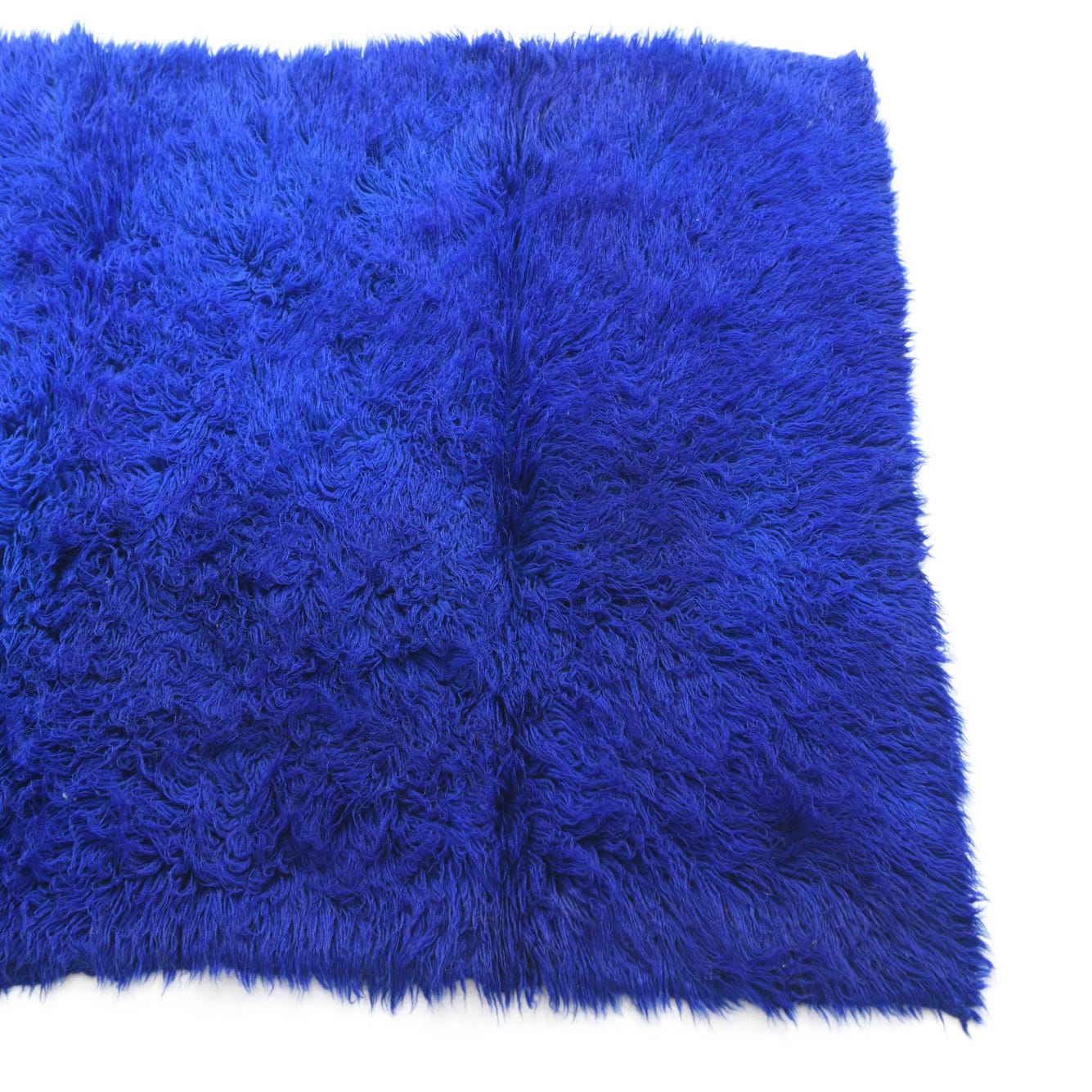 A vibrant blue 6 ft runner rug with a plush shag pile, handmade from wool, ideal for a hallway.
