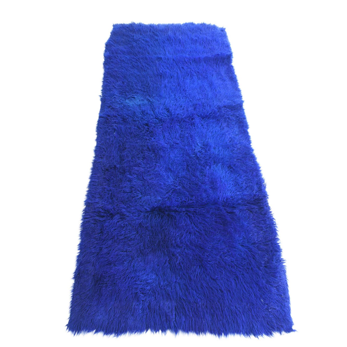 A deep, single-tone blue fills this hand-knotted wool runner, with rich, velvety pile that you can feel when you brush your hand across it. The design is intentionally simple — no defined motifs or borders — relying on the long, shaggy fibers and subtle directional changes in the pile to create depth and soft tonal variation. The wool construction gives the surface a slightly wavy, tactile texture with a dense, cushiony hand underfoot.
