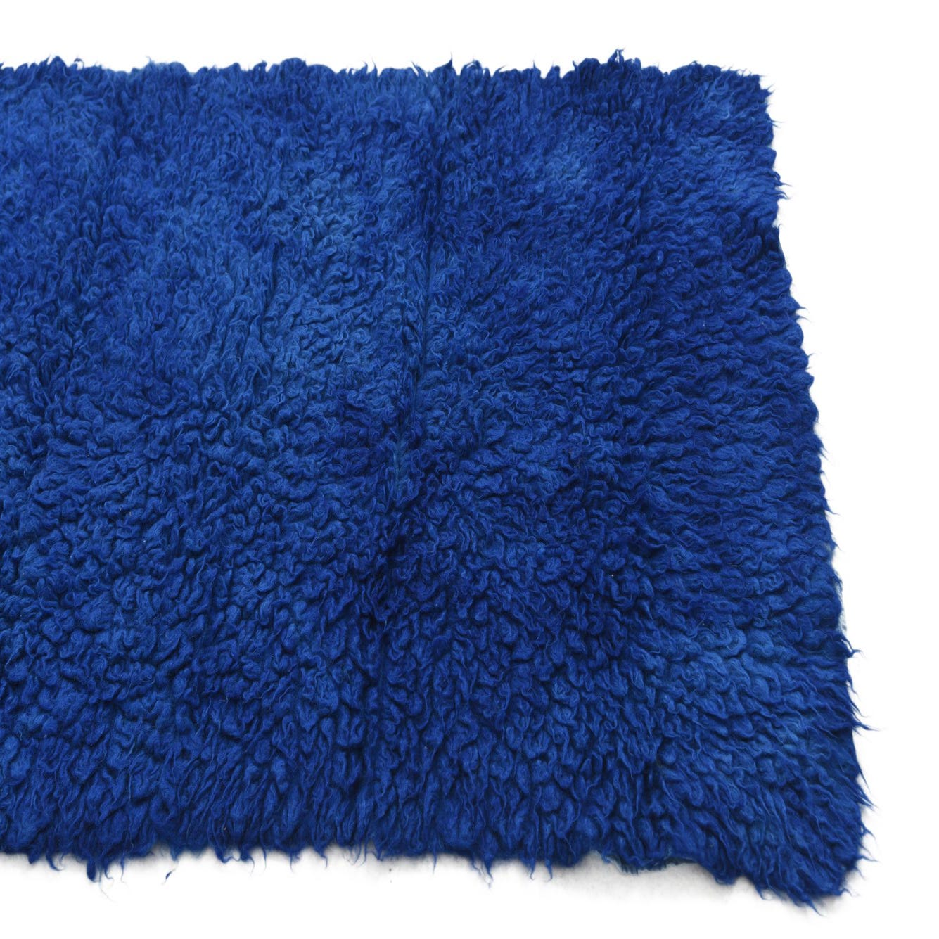 A plush, handmade 6 ft runner rug in a vibrant royal blue, featuring a shaggy texture, perfect for a hallway.
