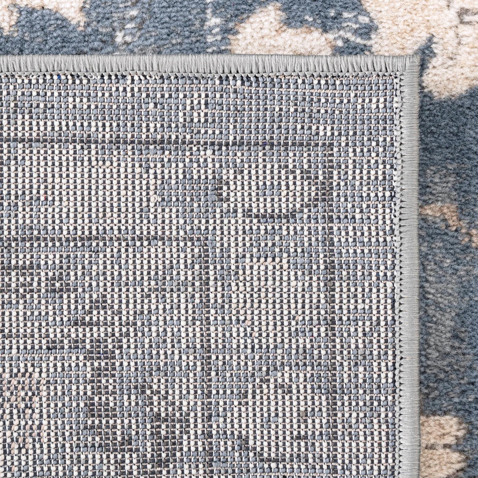 Primary color is Blue. Colors in this rug include: Blue, Beige, Ivory, Light Brown.
