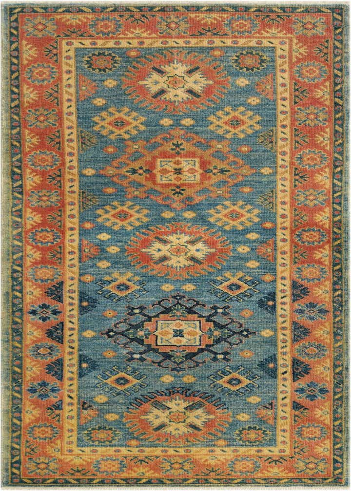 Primary color is Blue. Colors in this rug include: Blue, Brown, Cream, Navy Blue, Red.