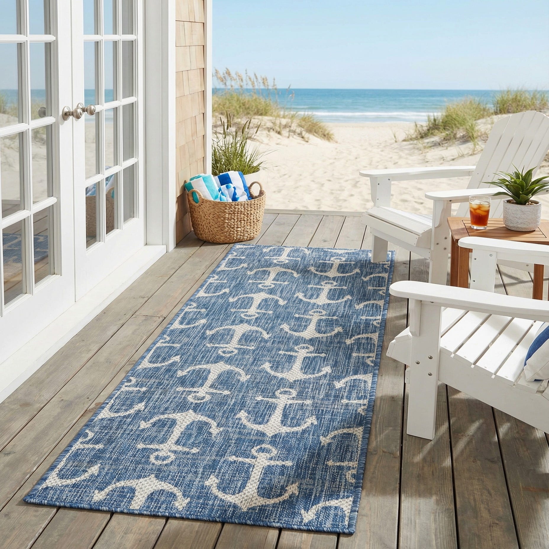 A 6 ft runner rug featuring a repeating pattern of white anchors on a textured blue background, perfect for a hallway or patio.