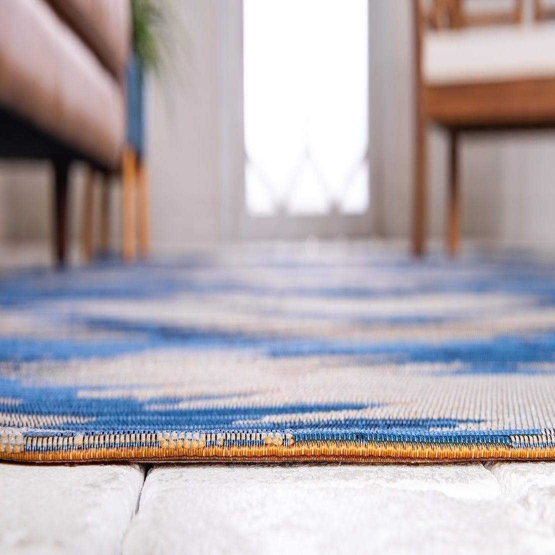 An abstract, horizontal striated pattern sweeps across a blue background in layered washes of navy blue and beige, creating a contemporary, waterlike effect. The design pairs irregular, brushstroke-inspired motifs with narrow linear ribbing for visible movement and depth. Machine made of 100% polypropylene, the rug has a low, slightly ribbed pile that feels smooth underfoot and holds its shape while providing tactile interest.