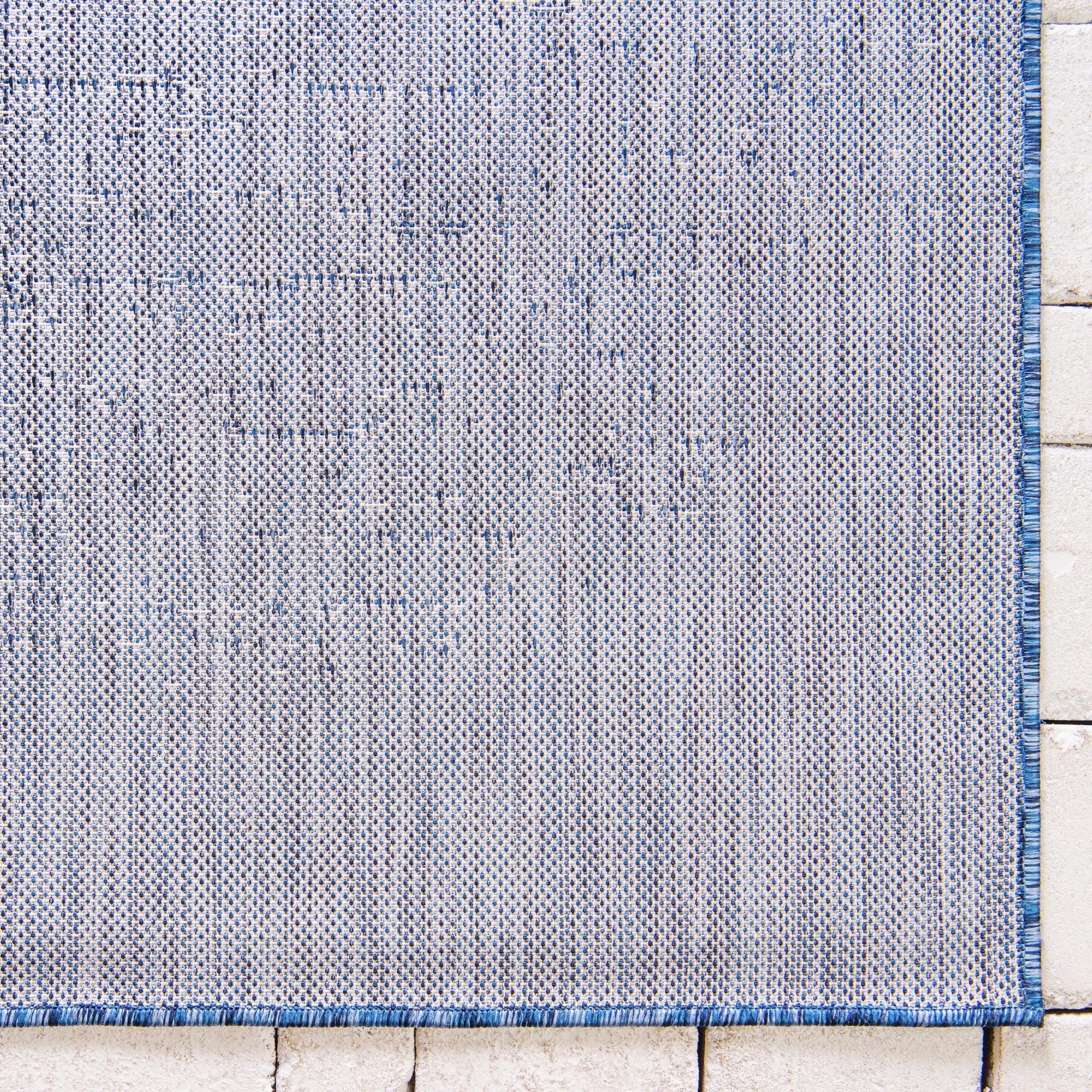 A soft, low-profile runner with a woven, striated surface that you can feel beneath your feet. The rug has a blue background that frames a central gray band; vertical grain-like lines and a lightly distressed transition give the pattern a layered, ombré effect. Machine made from 100% polypropylene, the construction produces a smooth, slightly ribbed texture that lies flat and keeps the design crisp across the length of a hallway or entry.