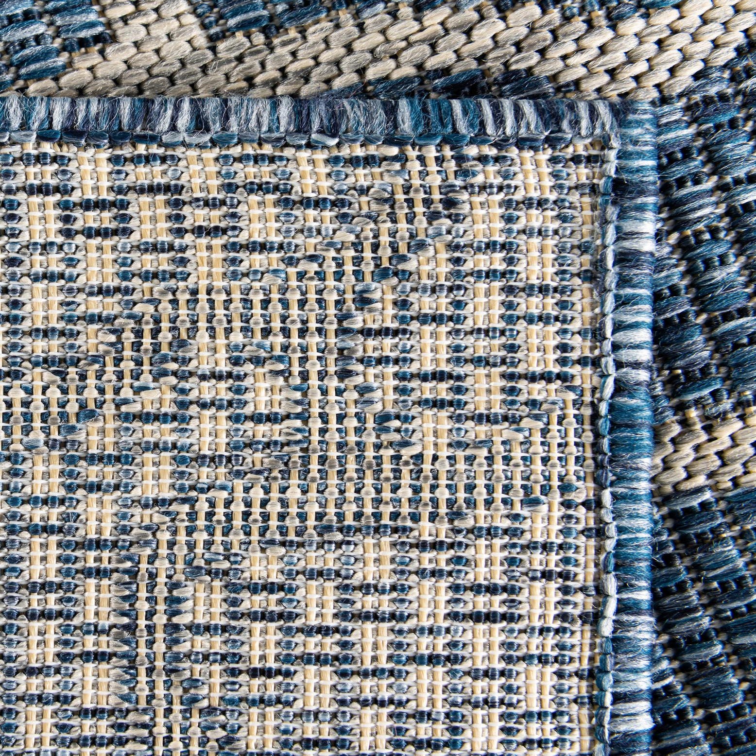 An organic, stone-inspired pattern of irregular gray shapes crosses a textured blue background, forming a modern, relaxed grid that catches the eye without overwhelming a space. The low-profile, woven surface has a slightly nubby hand that you can feel underfoot, and the contrasting gray outlines give the design crisp definition against the blue ground. Machine made of 100% polypropylene, the construction produces a stable, flatweave feel suited to both indoor and outdoor settings.