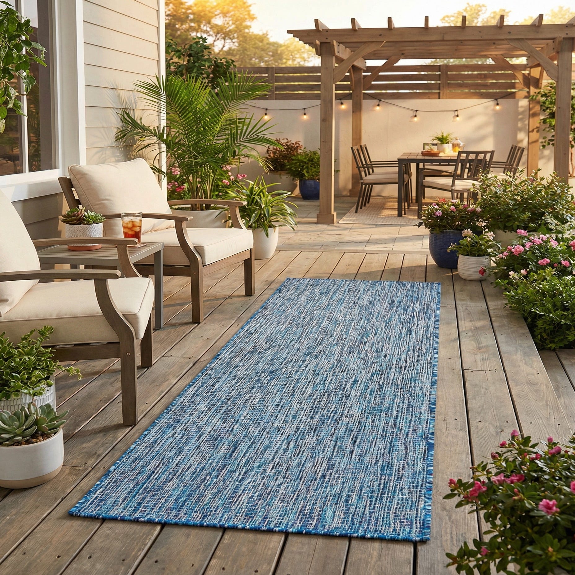 Machine made from 100% polypropylene, the rug has a low-profile, slightly textured surface that feels firm underfoot and sits nicely in high-traffic zones. Use it to define a hallway, kitchen aisle, mudroom, or covered porch; it pairs well with coastal and casual contemporary schemes as well as clean-lined modern or transitional interiors. Combine it with white or bleached wood floors, navy upholstered pieces, or natural woven accents like rattan and seagrass for a balanced, lived-in look.