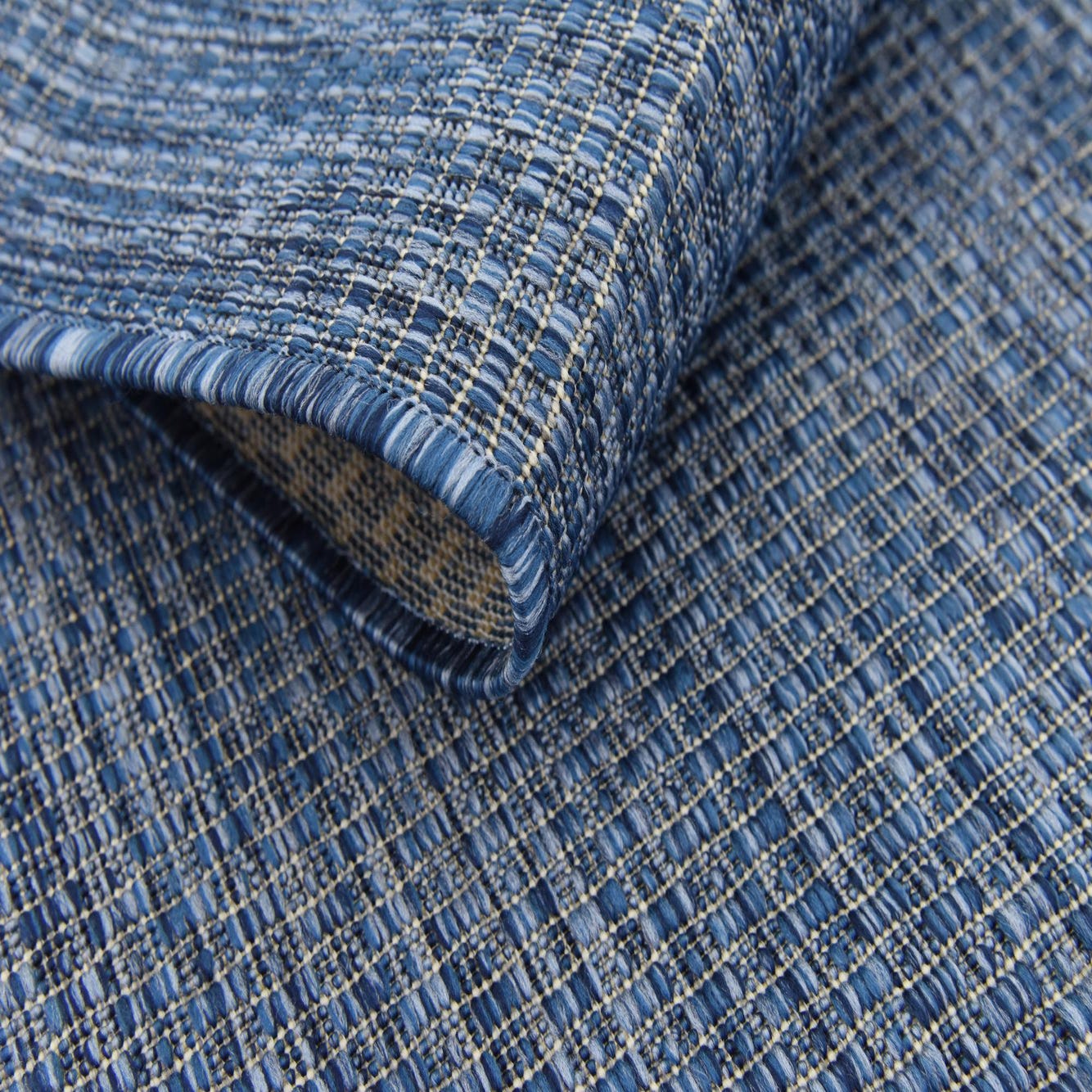 A 6 ft runner rug in varying shades of blue, featuring a modern, textured flatweave pattern, suitable for indoor or outdoor use.