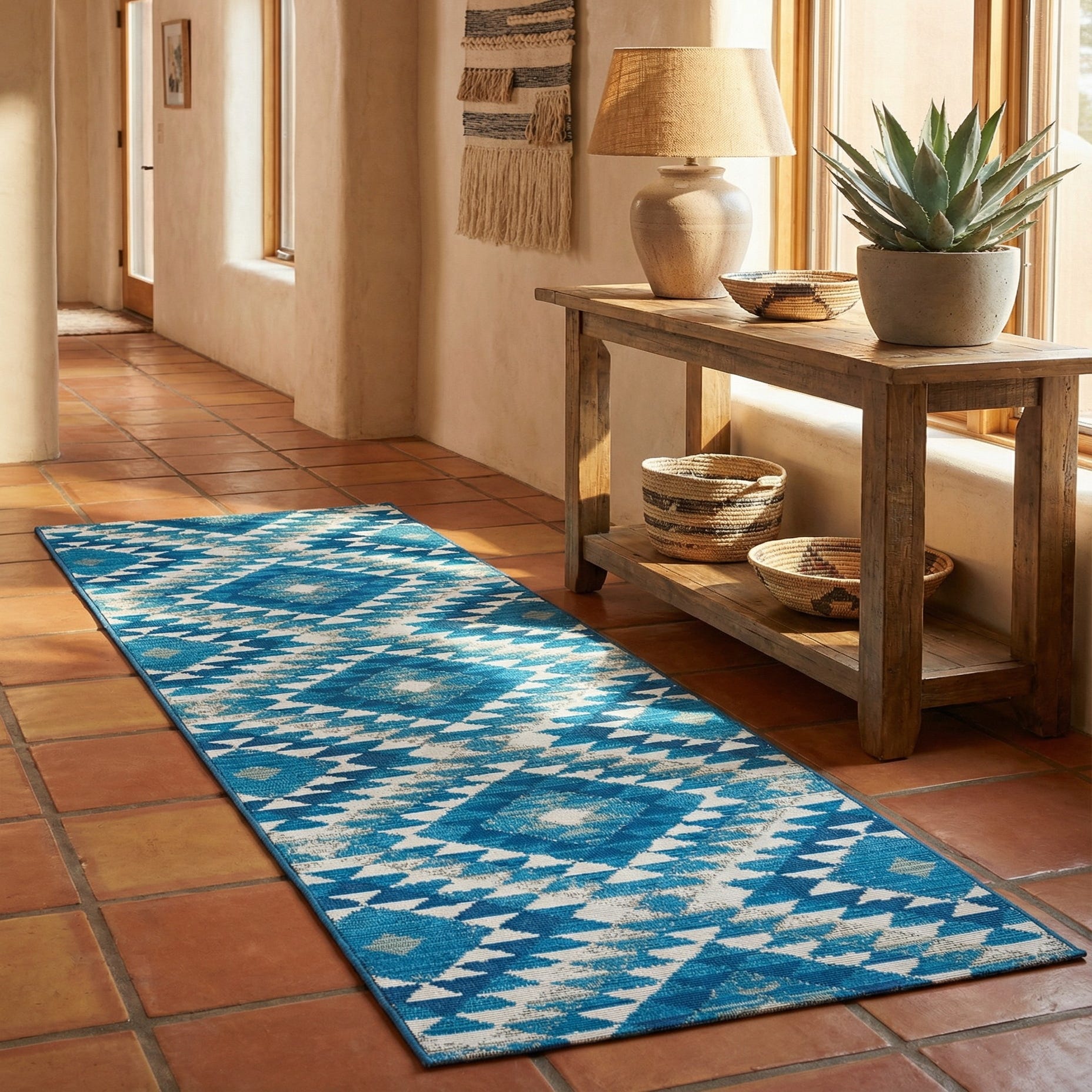 A bold Southwestern-inspired pattern of stacked diamonds and stepped triangles unfolds across a blue background, with navy, light blue, ivory and beige accents layered to create a gently distressed, dimensional look. Machine-made from polypropylene, the runner has a low-profile, tightly woven surface with a subtle ribbed texture that feels firm underfoot and shows the pattern with clear definition and color saturation.
