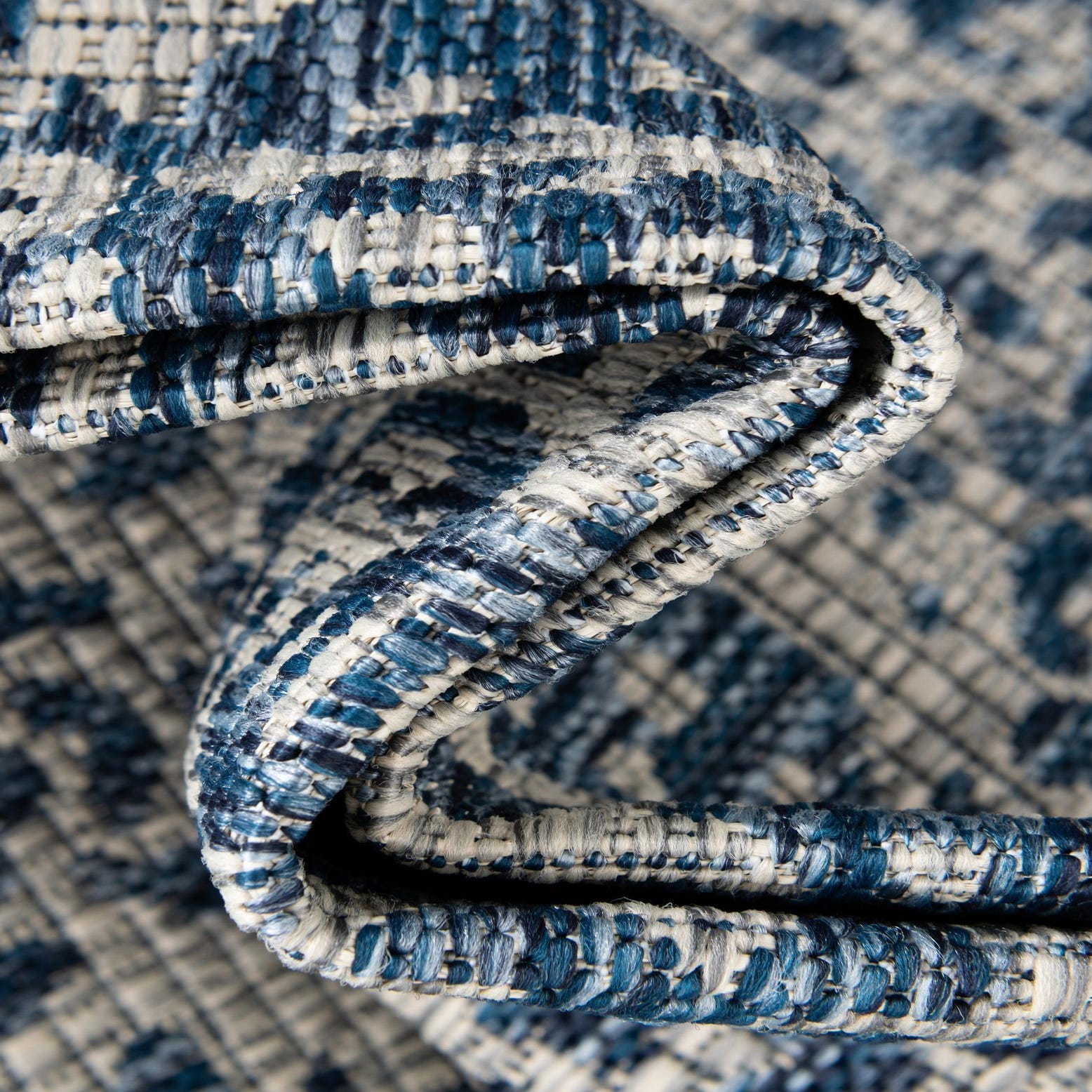 A 6 ft runner rug with a Southwestern medallion pattern in varying shades of blue and off-white, suitable for indoor or outdoor use.