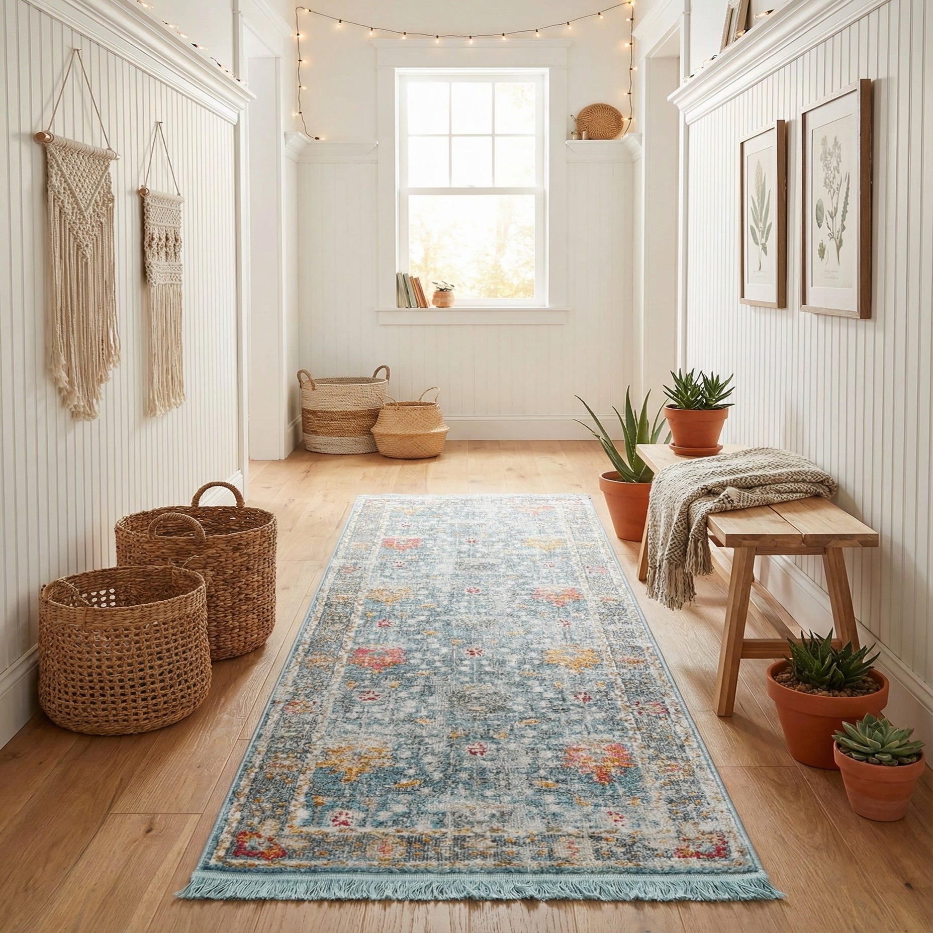 A 6 ft runner rug with a faded blue background, featuring a traditional floral pattern in pink, orange, and gray.