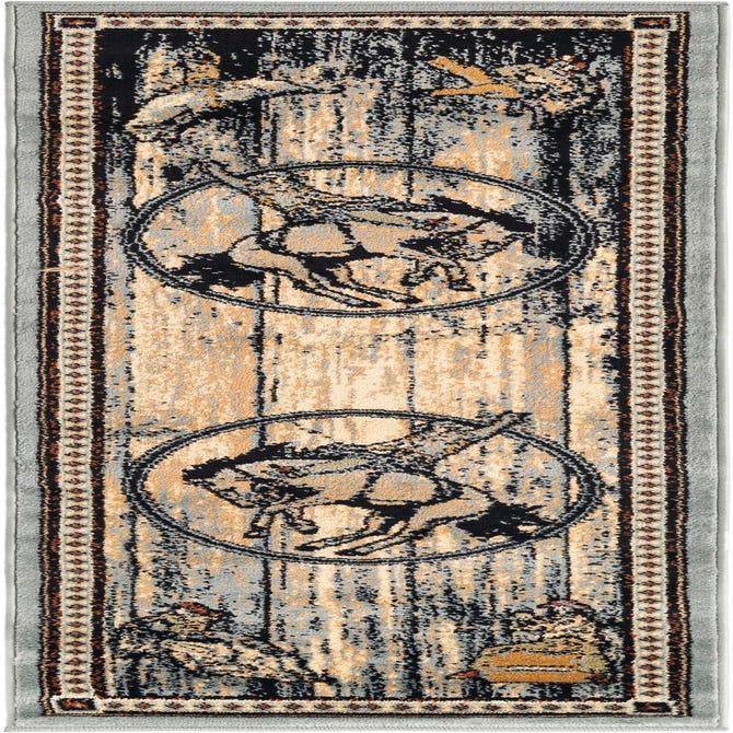A 6 ft runner rug from the Pioneer collection featuring a distressed blue and beige background with two circular motifs of a cowboy riding a bucking horse.