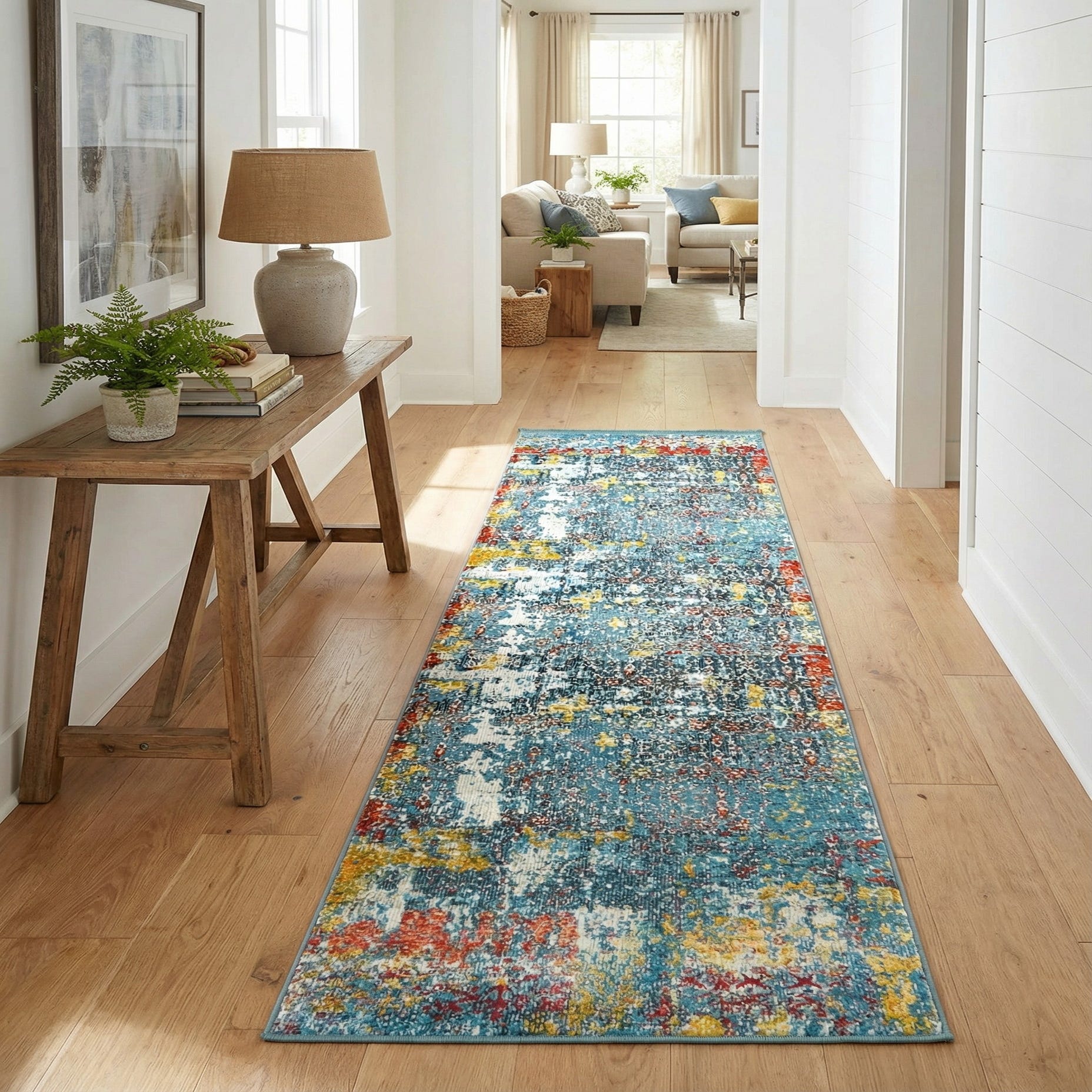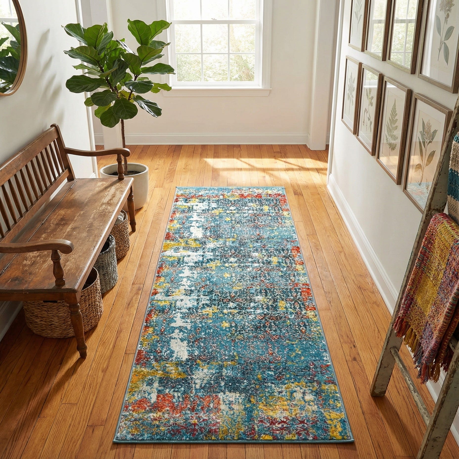 Designed as a runner, this piece works especially well in entryways and hallways to introduce color and movement. It also pairs nicely with light wood floors and neutral upholstery for a contemporary look, or with eclectic furnishings that pick up the olive and turquoise accents. Use it along a kitchen aisle, beside a bed, or layered over a larger neutral rug to bring warmth and pattern to narrow spaces.
