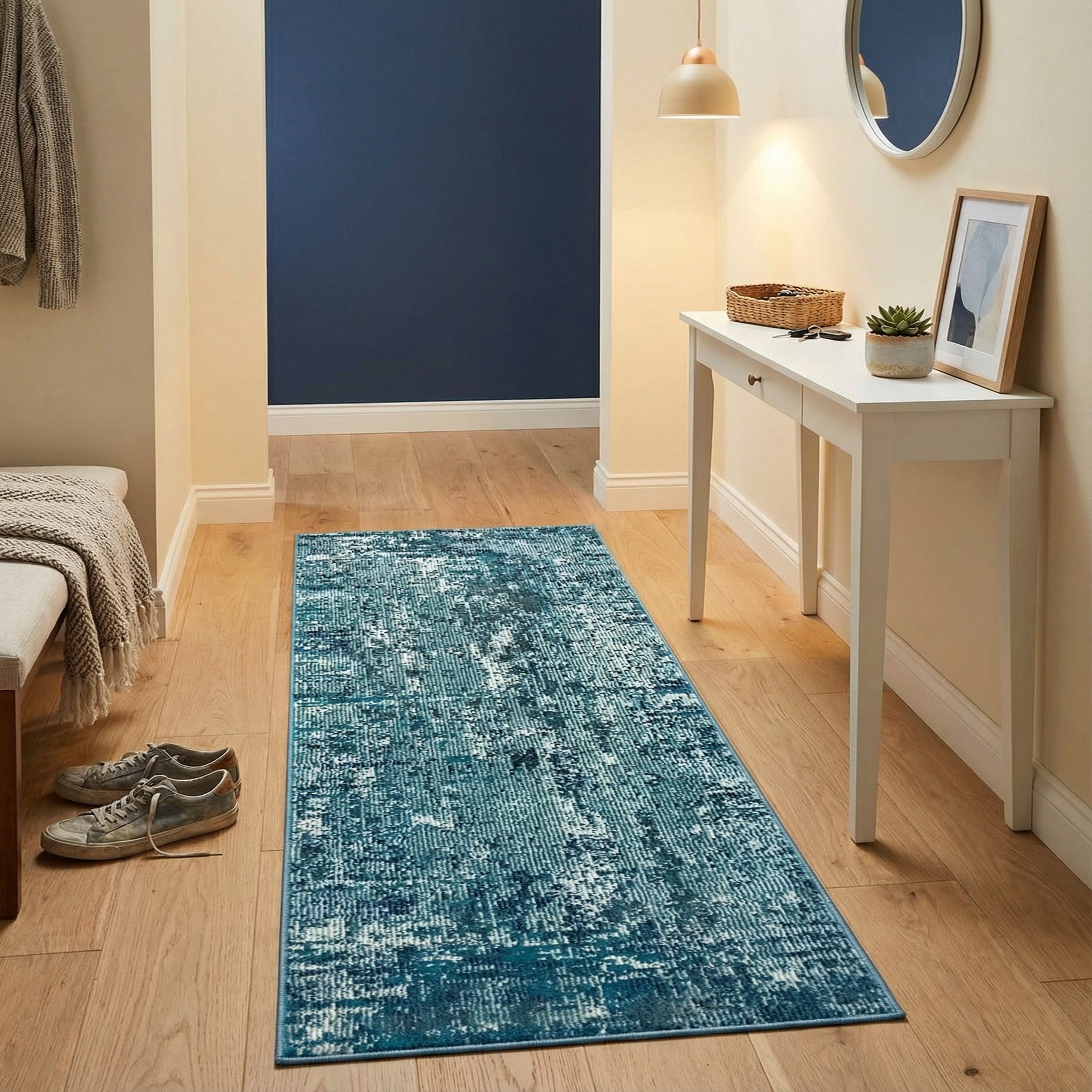 Ideal for narrow spaces, this runner works well in entryways, hallways, and alongside beds where color and pattern can guide traffic flow. It complements contemporary and coastal interiors, where the cool blue palette harmonizes with light wood floors, white trim and neutral upholstery, and it also fits nicely in modern transitional schemes when paired with gray sofas or teal accents.