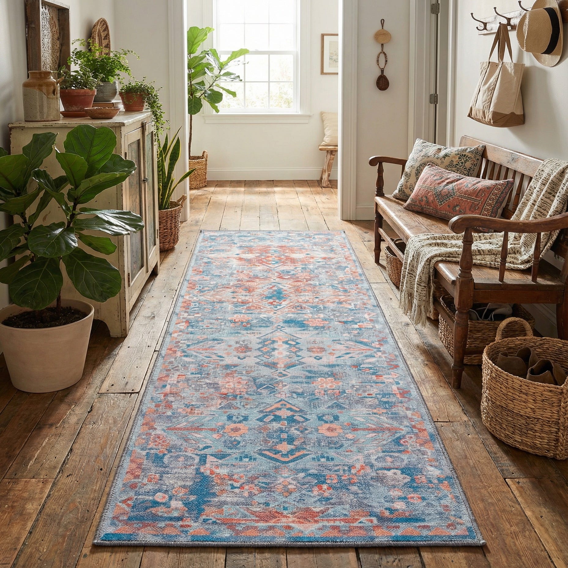 This style pairs well with casual, lived-in interiors — think a sunlit hallway with warm wood floors, a coastal or cottage entryway with white trim, or a contemporary boho kitchen where layered textures add interest. Use it as a hallway or entry runner, alongside a bed, or beneath a slim console to introduce color and pattern without overwhelming the room.