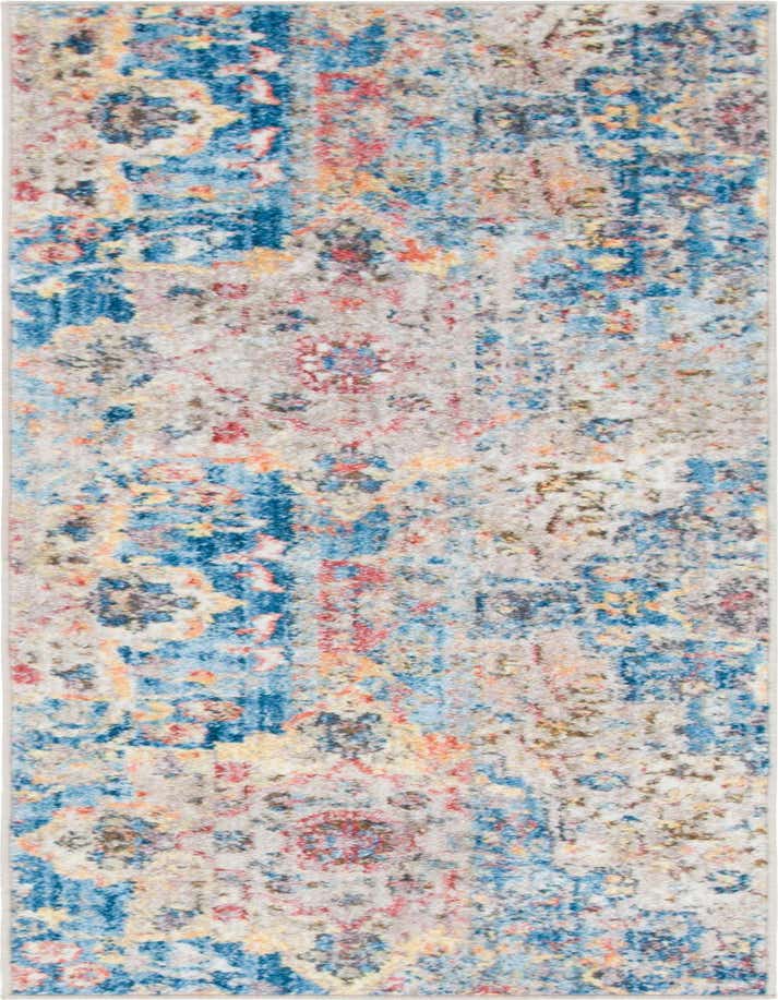 Primary color is Blue. Colors in this rug include: Blue, Beige, Brown, Orange, Red, Pink.