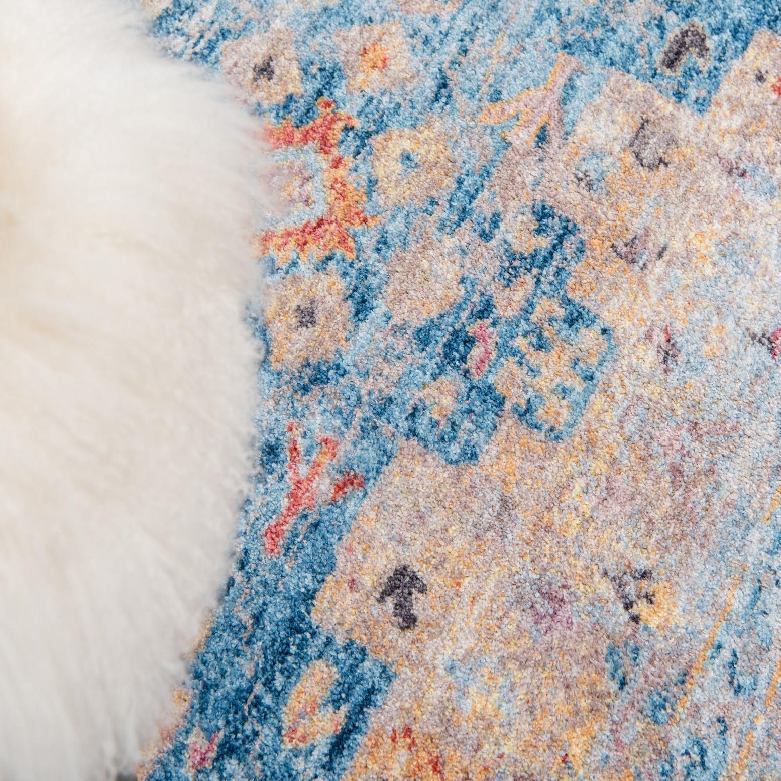 Primary color is Blue. Colors in this rug include: Blue, Beige, Burgundy, Gold, Navy Blue, Orange, Red, Pink.