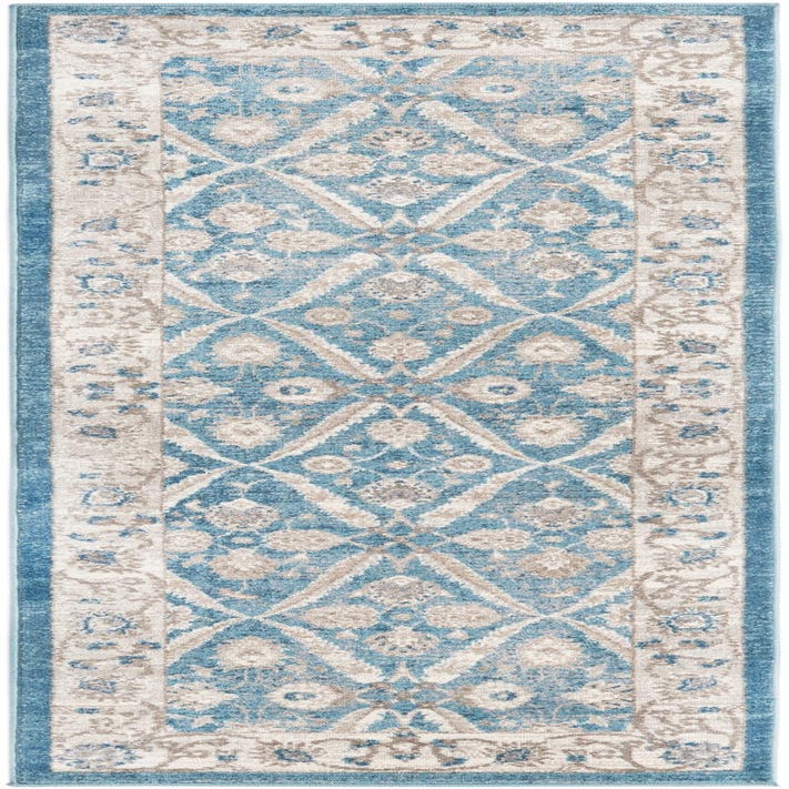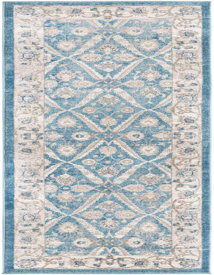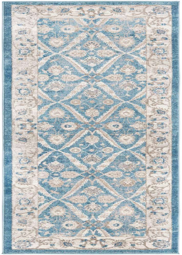 Primary color is Blue. Colors in this rug include: Blue, Ivory, Gray.