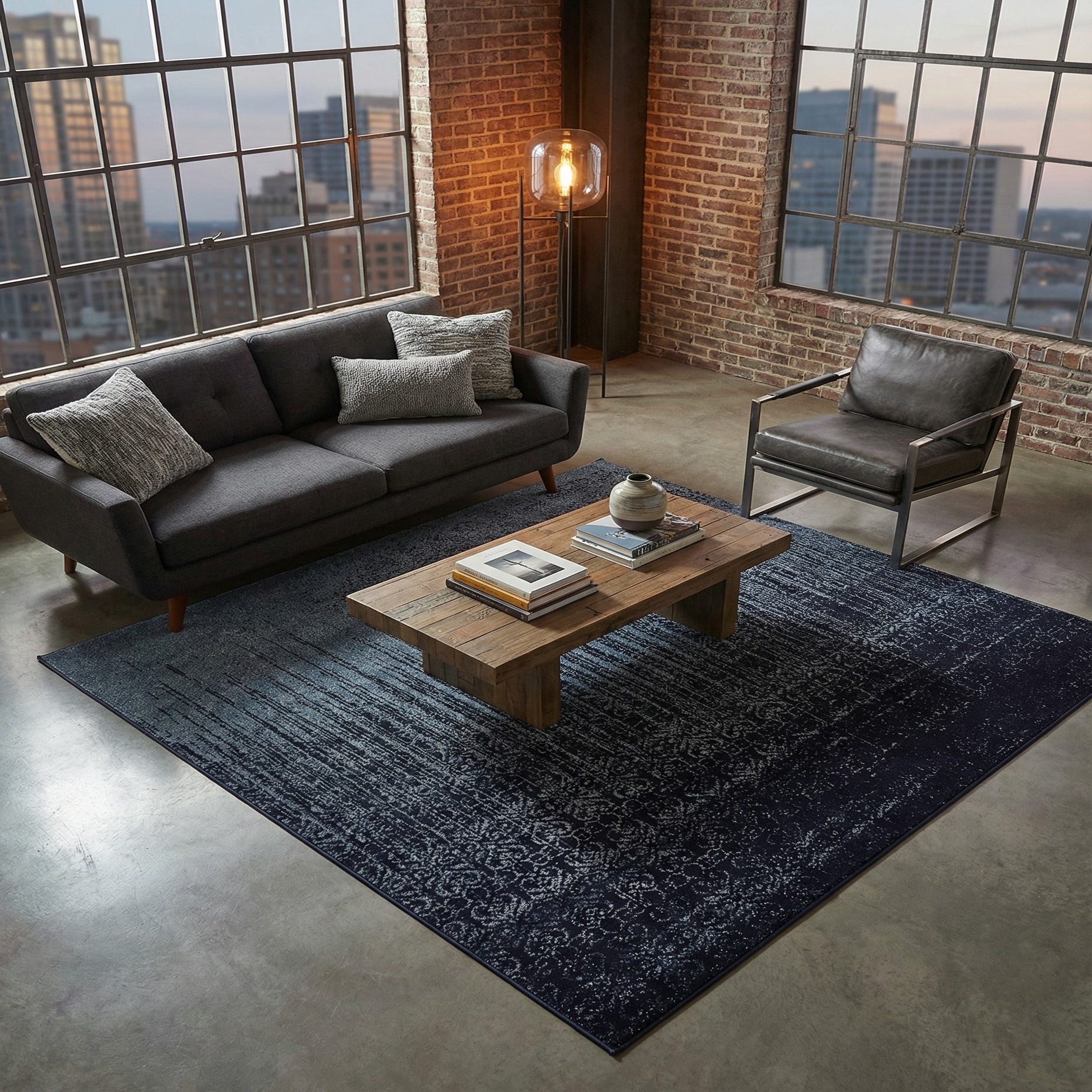 Primary color is Blue. Colors in this rug include: Blue, Navy Blue.