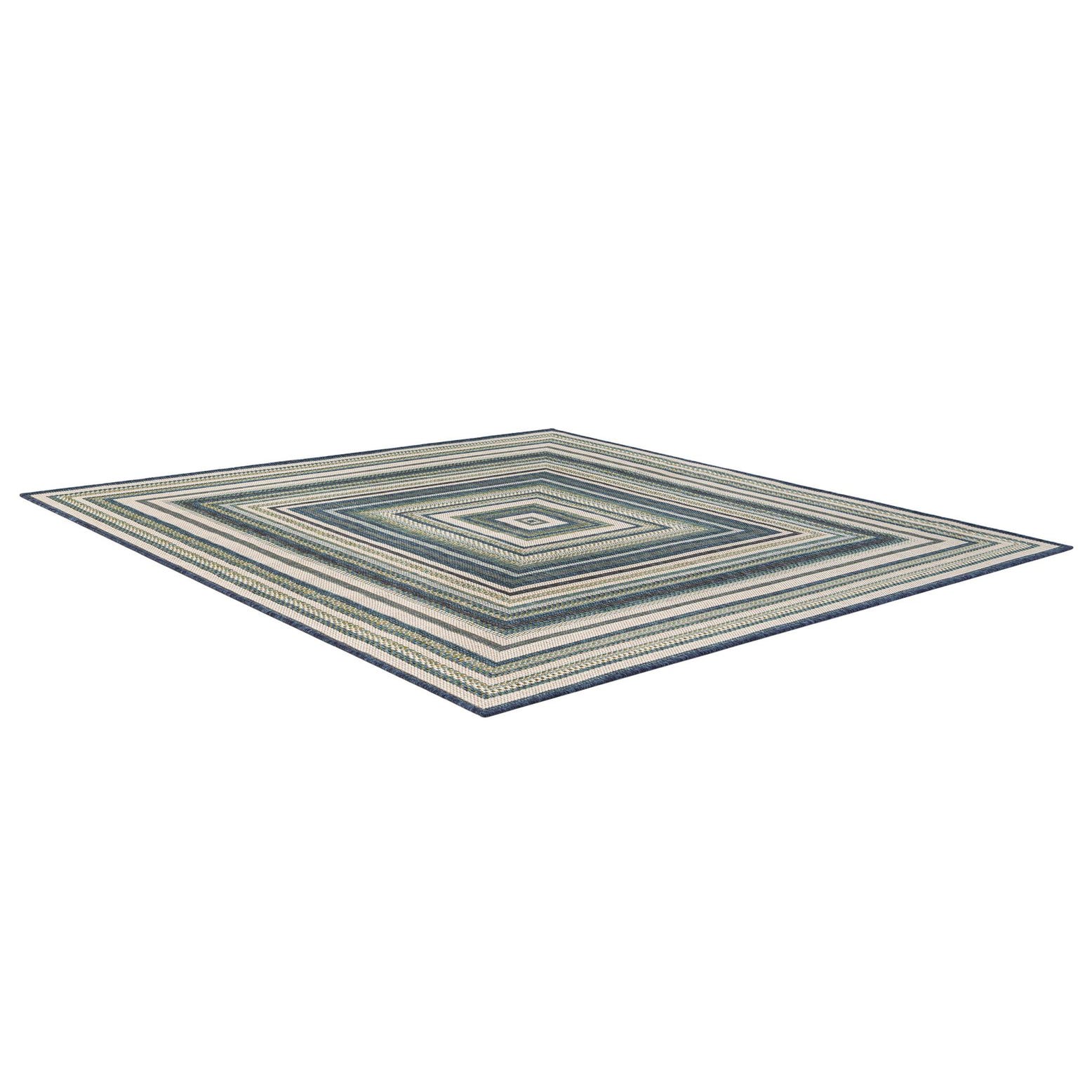 A 6'x6' square Baja Outdoor rug featuring a modern concentric square stripe pattern in various shades of blue and beige.