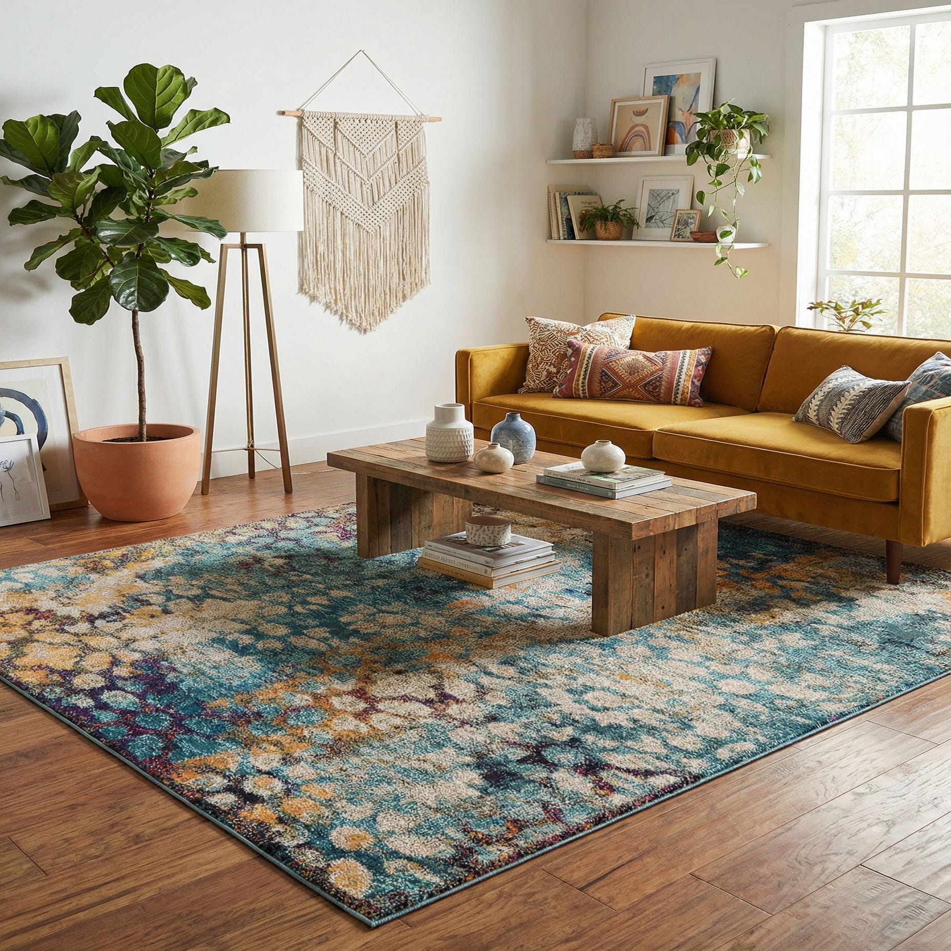 Place this rug where you want color and pattern without overpowering the room: anchored beneath a living room seating group with a neutral linen sofa, layered over wood floors in a transitional dining area, or used to introduce a lively contrast in a modern home office. It pairs particularly well with warm wood tones, navy or teal upholstery, and mixed-metal accents, and also complements relaxed coastal, bohemian, or eclectic interiors.