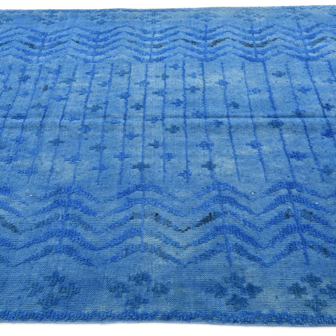 The Darya Collection presents a hand-knotted 100% wool rug in a captivating 6 ft square format, distinguished by its rich, monochromatic blue palette that ranges from vibrant to navy blue. This rug showcases a dynamic pattern with organic, wave-like motifs that create a sense of movement, rhythmically flowing across the surface. The deep, uniform blue background is punctuated by these varying blue tones, which add depth and visual intrigue.